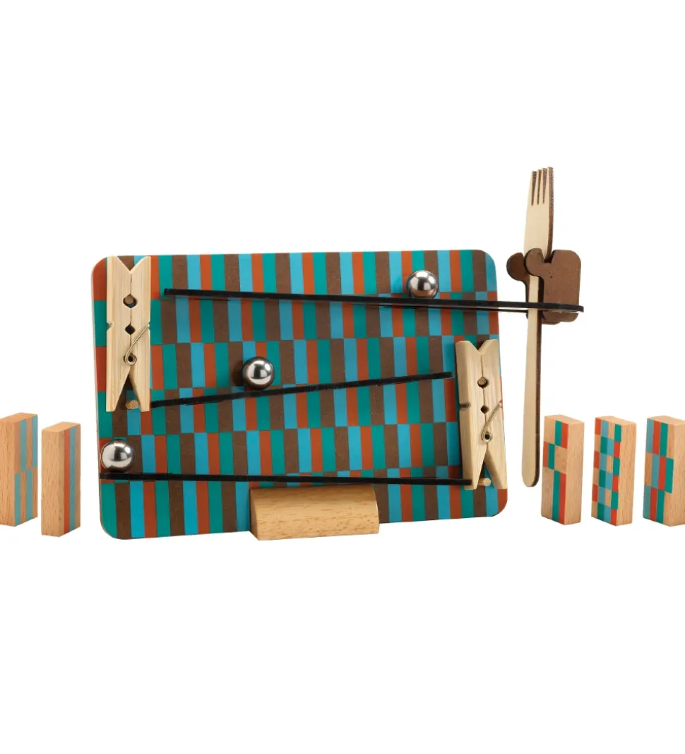 Sjov Djeco kuglebane af træ, hvor der kan laves baner med en gaffel, klemmer og klodser.