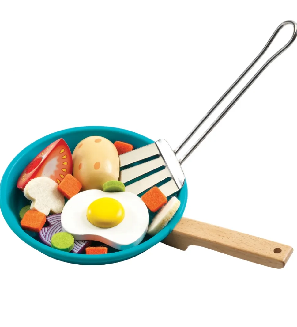 Djeco legemaden består af spejlæg, bacon og grøntsager. Alt du skal bruge til at lave lækkert biksemad. Barnet kan lave maden i stegepanden eller i det ovnfaste fad, og med den lille paletkniv kan maden vendes godt. Æsken som sættet leveres i bruges som komfur.