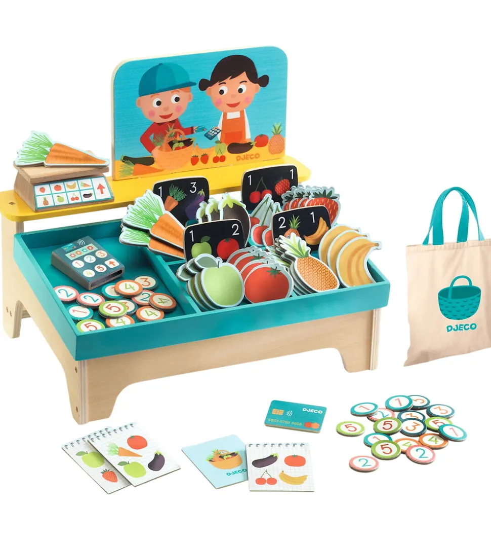 Sættet består af en lille markedsbod med æske med tre rum, en disk og en varevægt. Der medfølger masser af varer, så ungerne rigtigt kan slå sig løs.