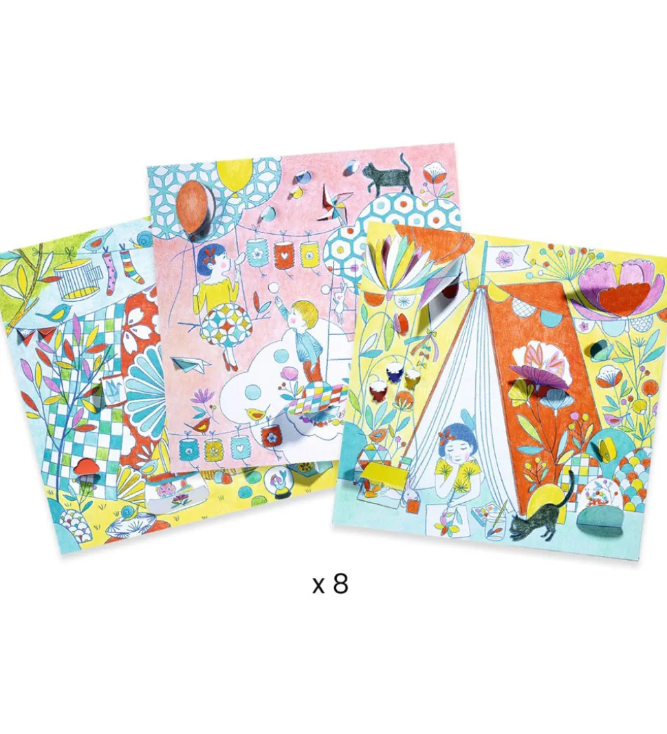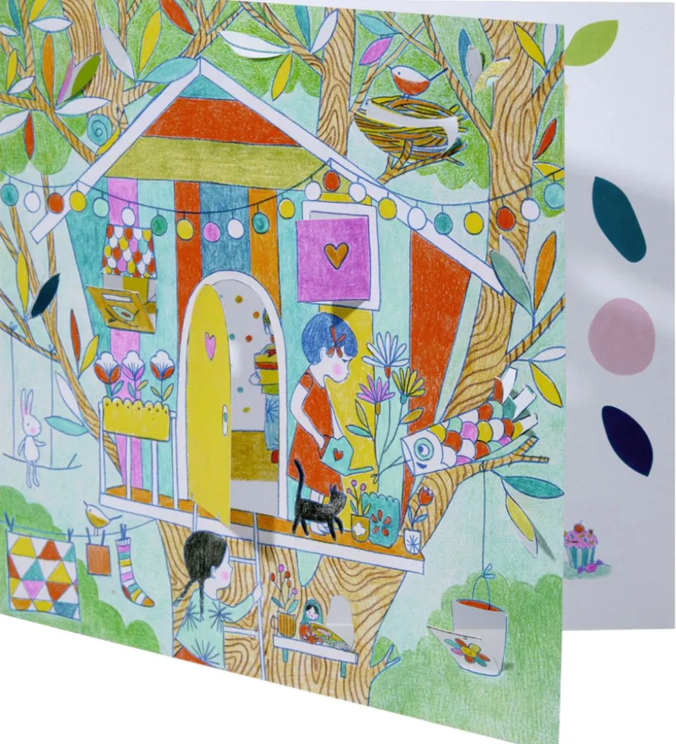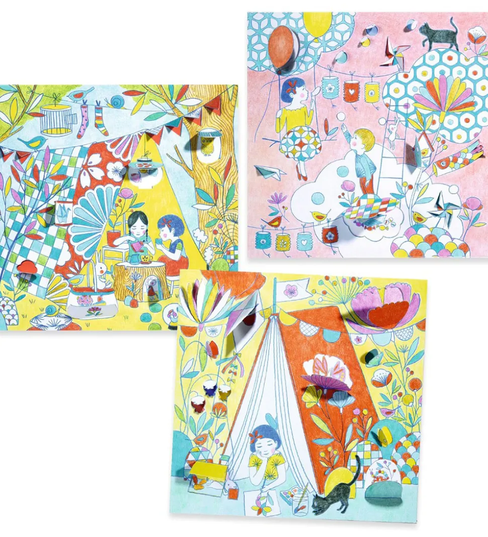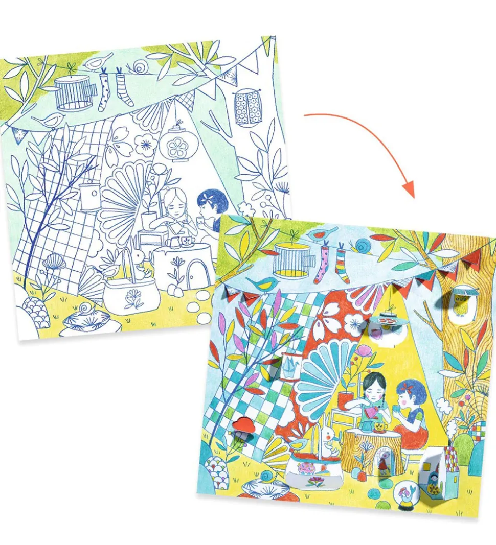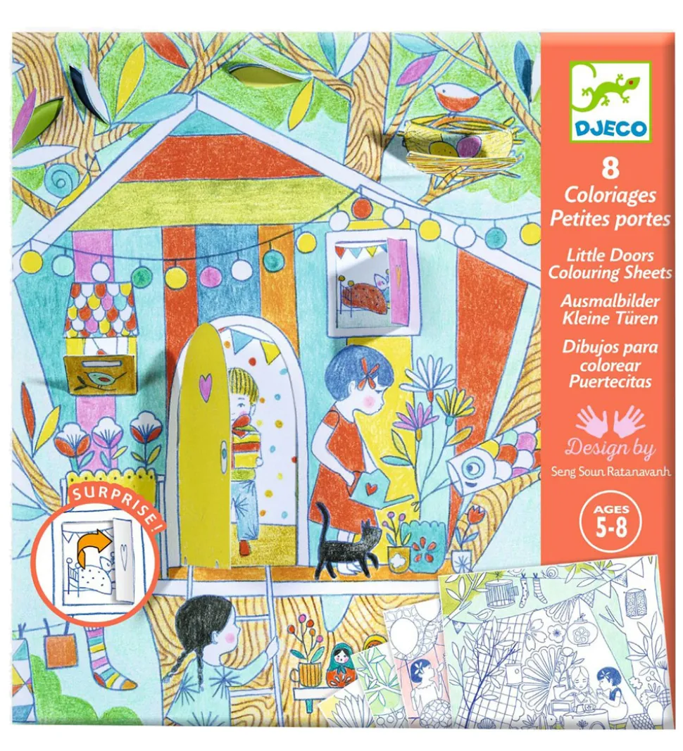 Sød Djeco malebog med små døre. Malebogen består af 4 forskellige ark med flotte, hemmelige motiver.