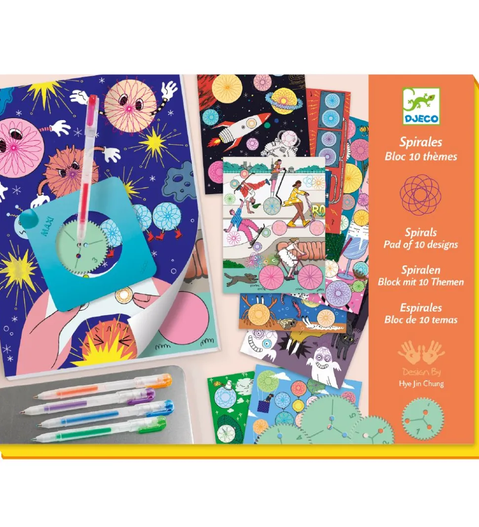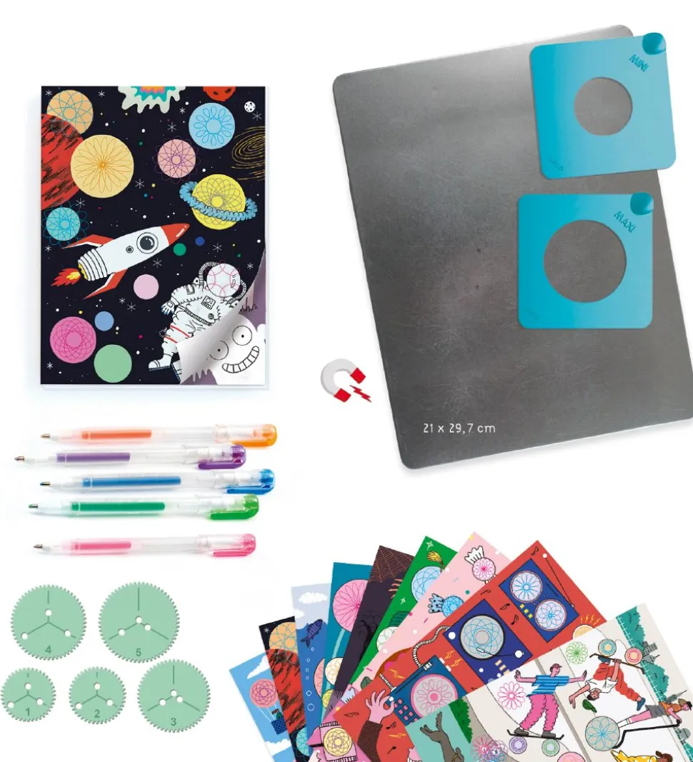 Smart Djeco malebog bestående af fem farverige kuglepenne, 5 spiraler, en magnetisk plade og en blok med tegnesider, som man kan tegne forskellige mønstre på med tandhjulene og tegnepladen.