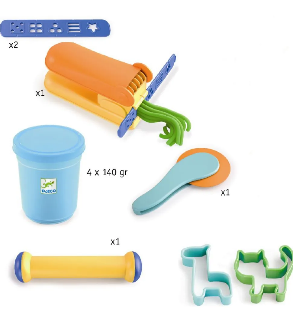 Djeco modellervoks-sættet har alt hvad der skal til at lege med modellervoks og skabe flotte og sjove figurer.