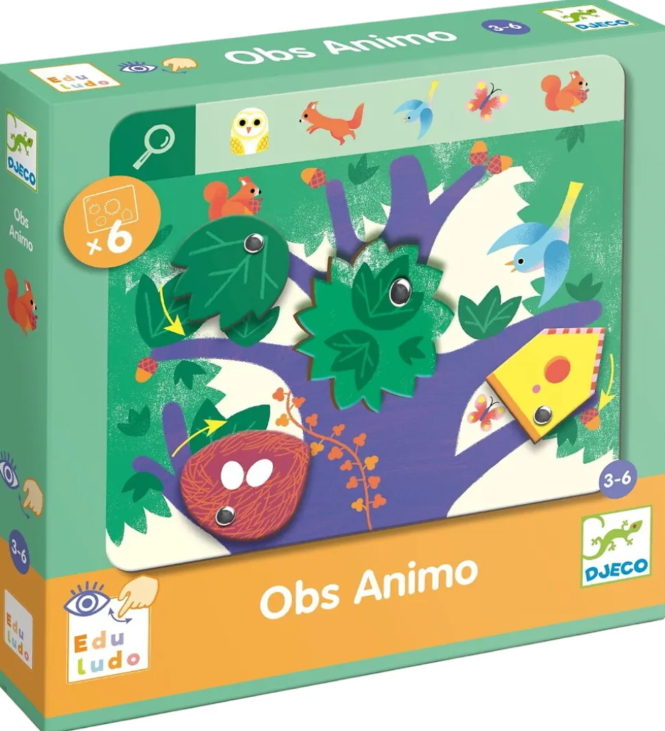 Djeco spillet består af 6 kort med forskllige motiver i klare farver og med masser af detaljer. Her gælder det om at gøre sig umage med at finde de skjulte motiver bag brikkerne, som kan drejes til side.