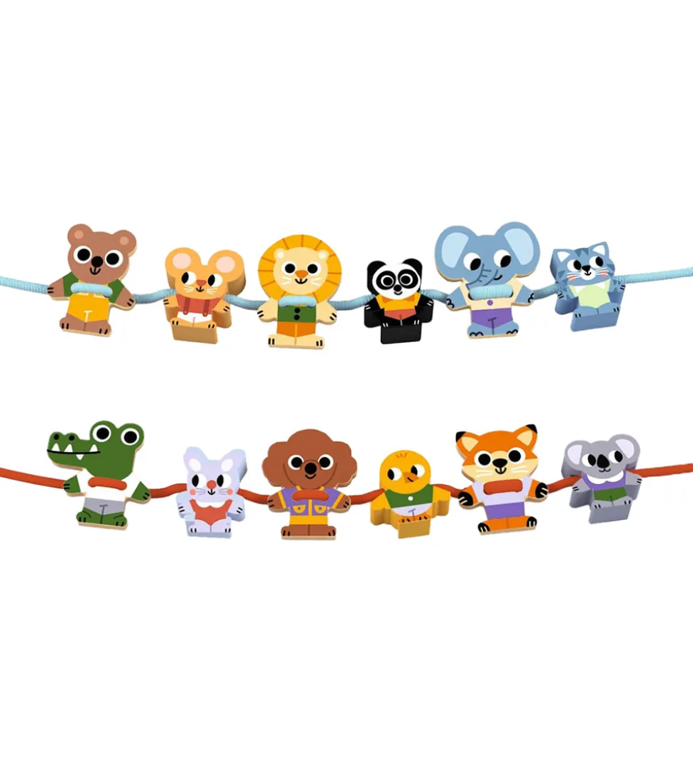 Sjove Djeco perler bestående af 12 perler i træ med motiver af dyr og 2 snore i blå og grøn.