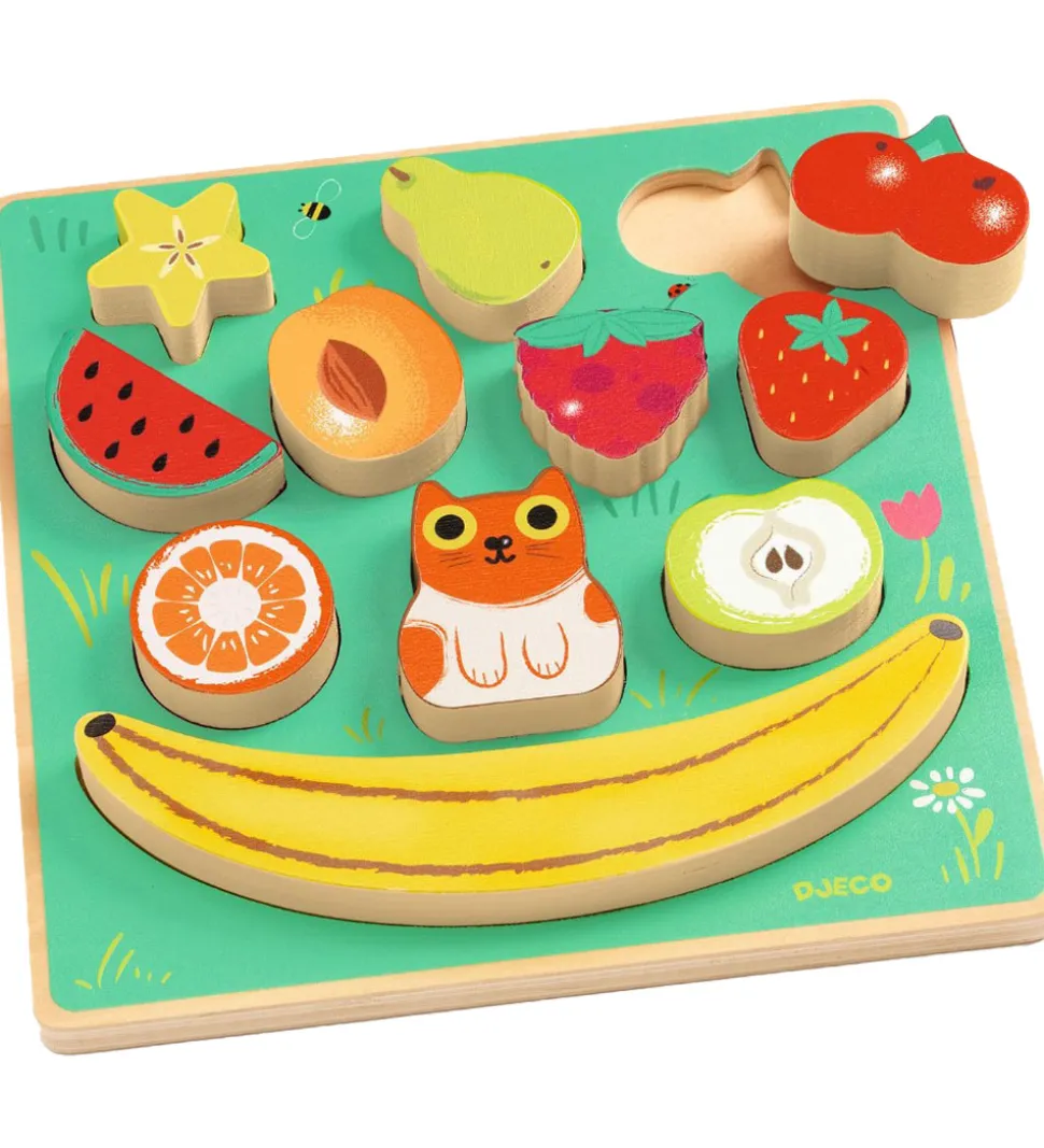 Sjovt Djeco puslepil af træ, med motiver af en kat og frugter.