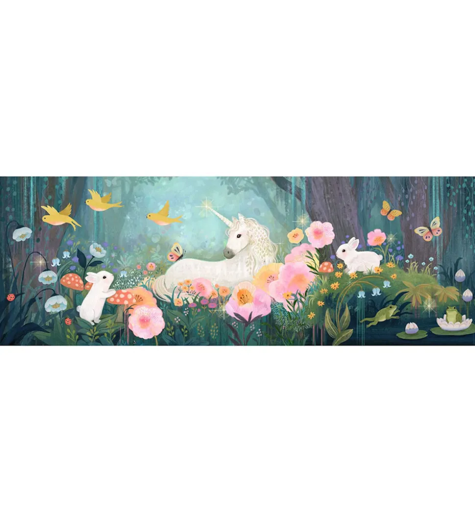 Kunstnerisk Djeco puslespil med motiv af en enhjørning i en blomstrende skov, som er malet af kunstneren Kendra Binney.