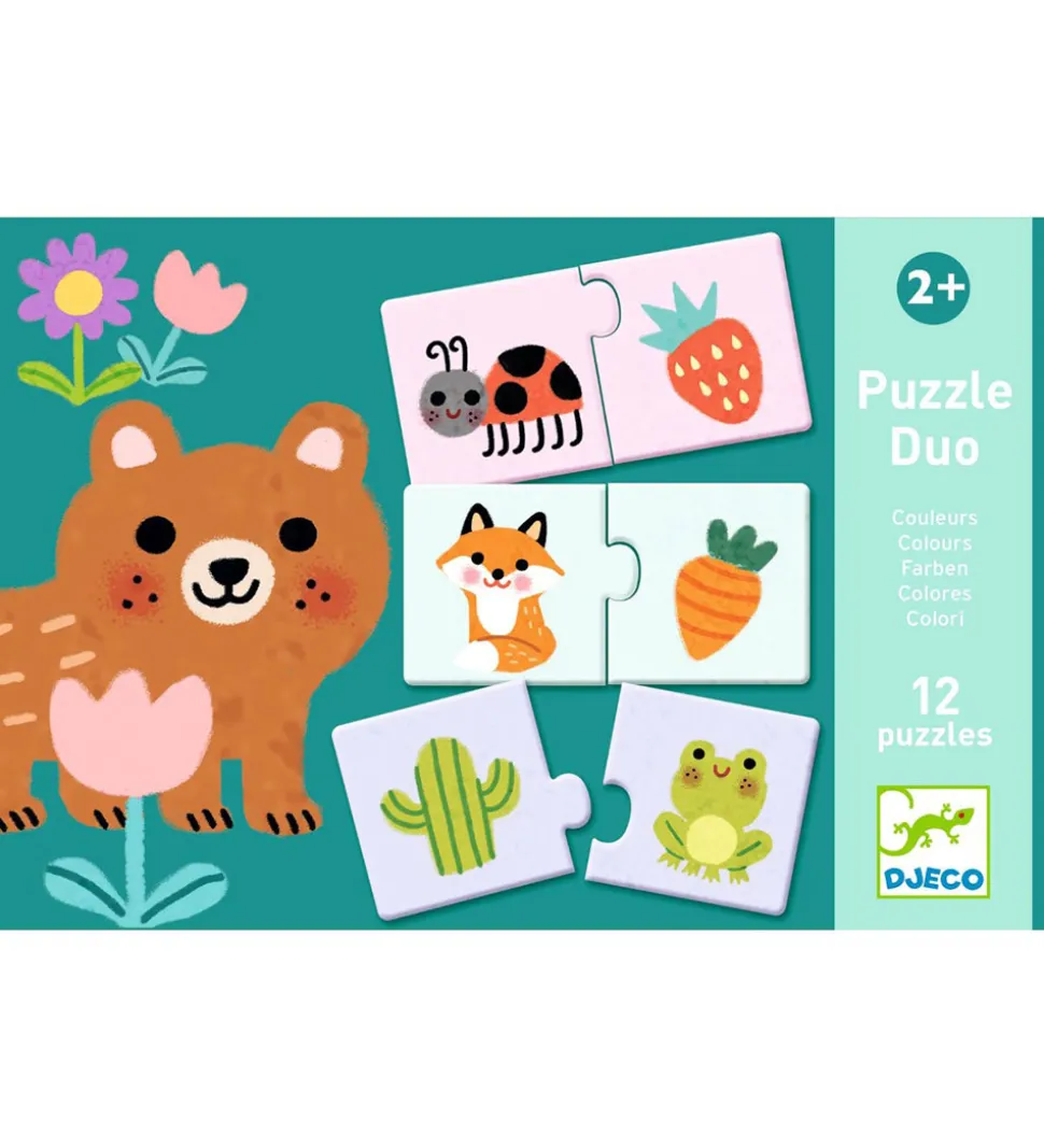 Underholdende Djeco puslespil med motiver af søde dyr, planter, frugt og andre fine ting. Det inderholder 12 forskellige puslespil med to brikker i hvert. Puslespilsbrikkerne sættes sammen, så farverne på de to brikker er ens.