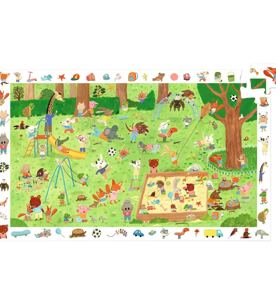 Djeco puslepillet består af 35 brikker af kraftigt pap. Når puslespillet er lagt, kan man prøve at finde de forskellige motiver vist langs kanten af puslespillet. Der medføger også en plakat med den flotte illustration.