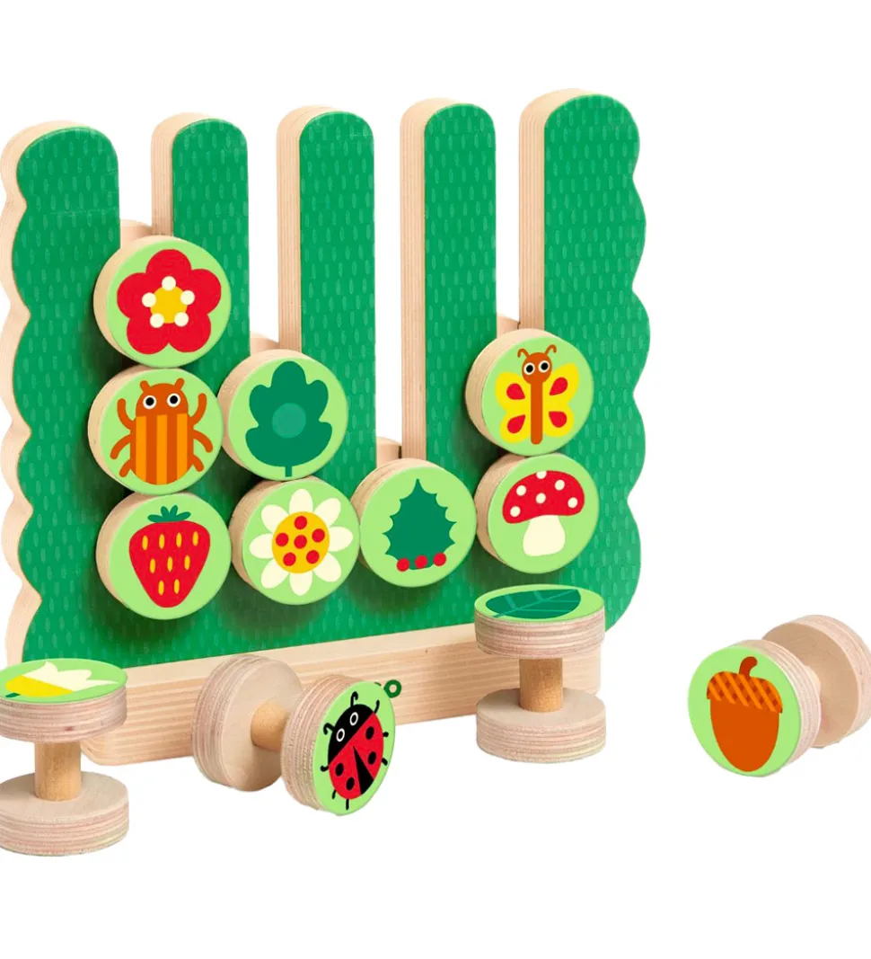 Djeco puslespillet består af en stående plade og 12 runde træbrikker med motiver fra haven, der sættes ned i pladens fire riller. Der medfølger 10 dobbeltsidede kort med i alt 20 måder at sætte træbrikkerne i rillerne på, som barnet skal kopiere – ligesom et puslespil. Puslespillet er perfekt til små barnehænder og nemt at rydde væk.