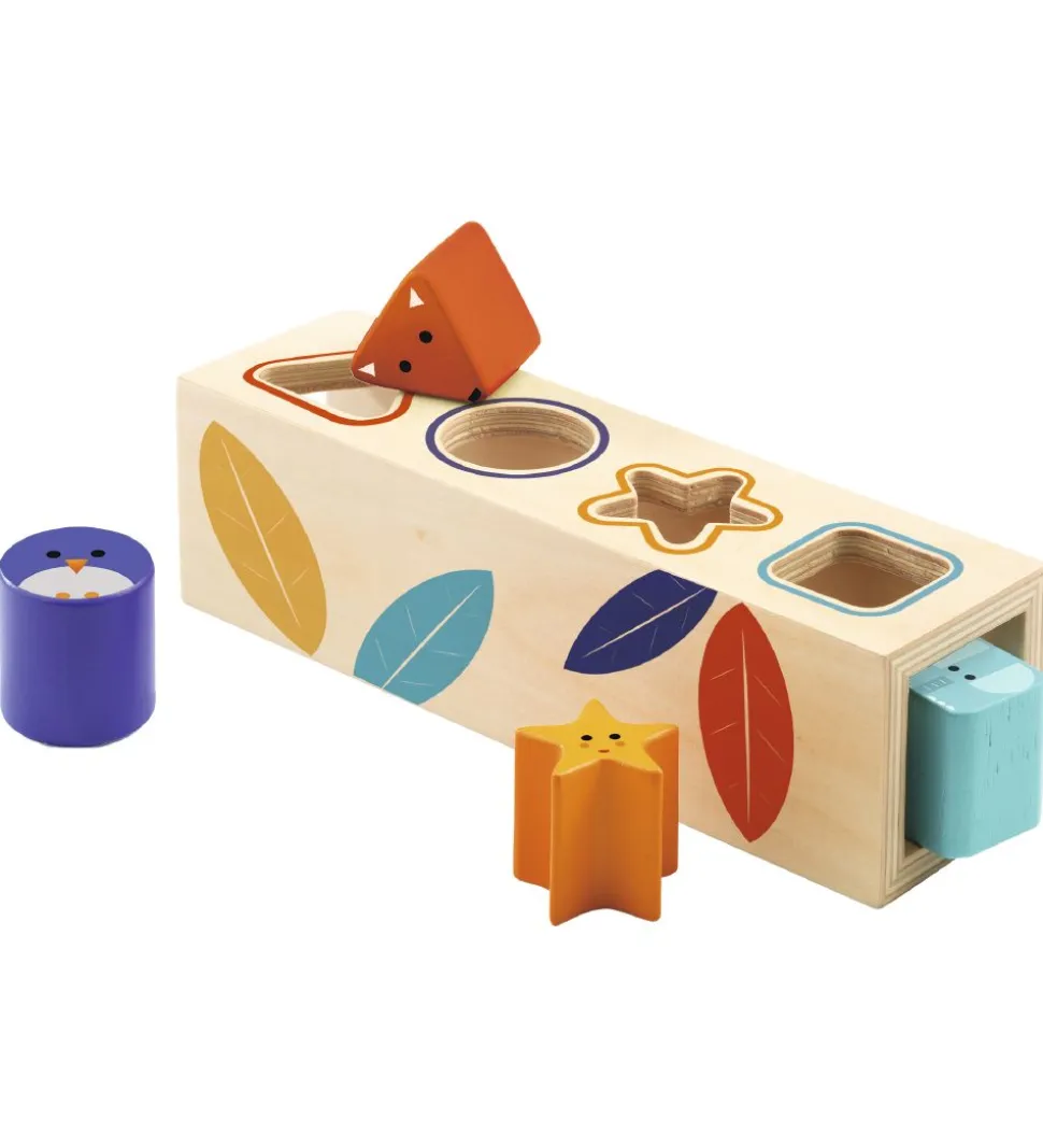 Fin Djeco puttekasse af træ med print af blade i forskellige farver.