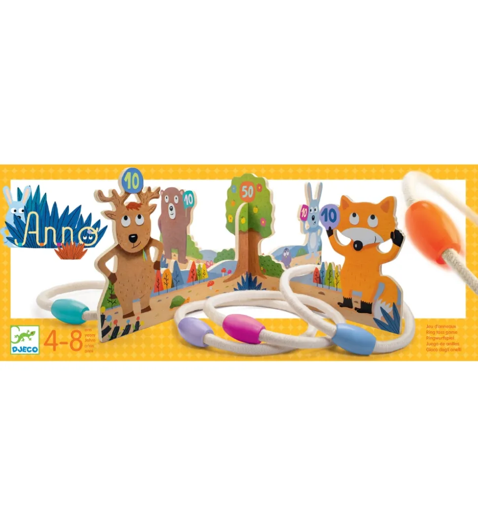 Djeco ringspillet består af to dele, som let sættes sammen i et kryds med fire dyr i siderne og et træ i midten. Spillet gælder om, at kaste ringene efter dyrene og træet for at få flest mulige point, hvor dyrene giver 10 point og træet giver 50 point. Spillet bliver kun sjovere, når man er blevet god nok til at gøre afstanden til dyrene længere. Sættet kommer i en praktisk pose, så det let pakkes sammen og transporteres.