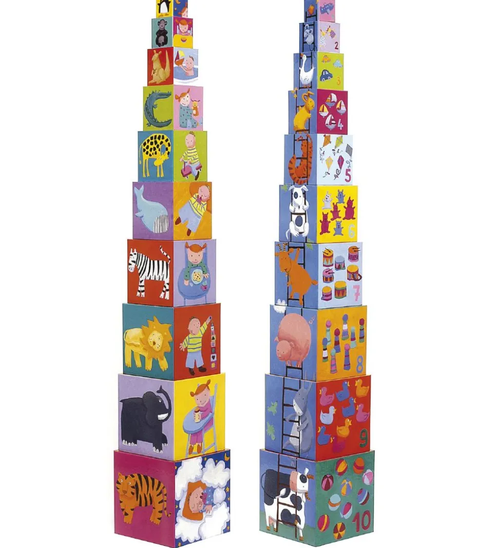 Djeco spillet går ud på at få stablet kasserne ovenpå hinanden efter størrelse. Undervejs kan man tale om de mange forskellige tal og dyr der er på kasserne. Indeholder 10 kasser.