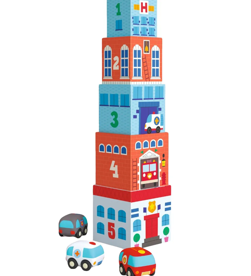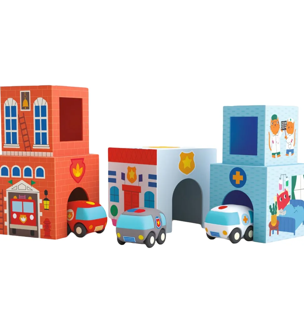 Djeco spillet går ud på at få stablet kasserne ovenpå hinanden efter størrelse. Kasserne er dekoreret med print af hospital, politistation og brandstationer, så de kan stables til huse. Undervejs kan man tale om de mange forskellige tal og dyr der er på kasserne. Indeholder 5 kasser og 3 biler.