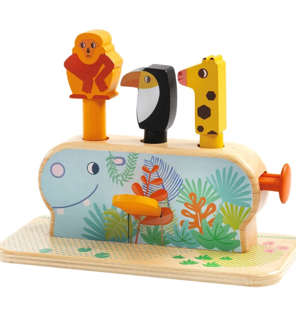 Sjovt Djeco trælegetøj bestående af en base med form som en flodhest, med et print på den ene side af en flodhest og blomster samt tre figurer af en abe, en tukan og en giraf.