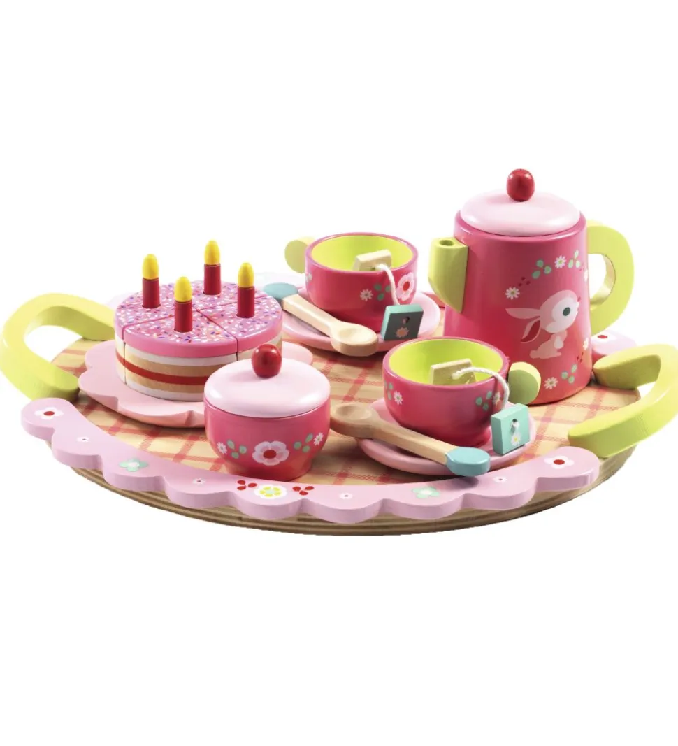 Fint Djeco trælegetøj i form af et skønt te- og kagestel i rosa og grønne nuancer med print af blomster og kaniner.