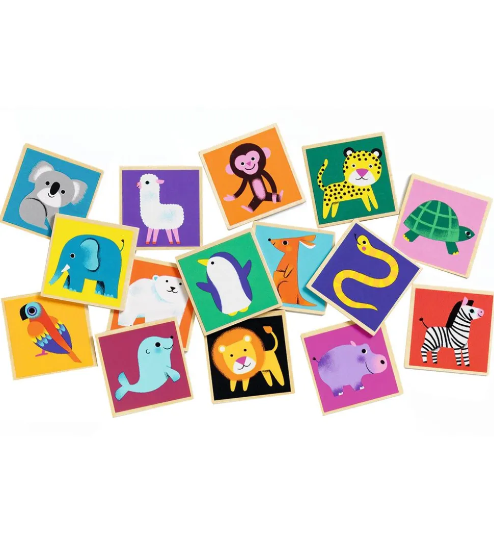 Djeco huskespillet består af 32 kvadratiske træbrikker, der sætter børnens hukkomlese på prøve. Brikkerne blandes og spredes ud med motivet nedad, og herefter går jagten efter ens par i gang. Brikkerne kommer i en praktisk æske, så det let kan pakkes sammen og transporteres.