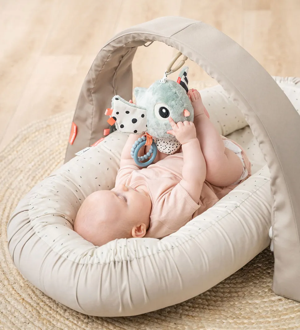 Aktivitets- og sanselegetøjet har en praktisk aftagelig plastikring, så den kan hænges på barnevognen, tremmesengen, kravlegården eller autostolen.