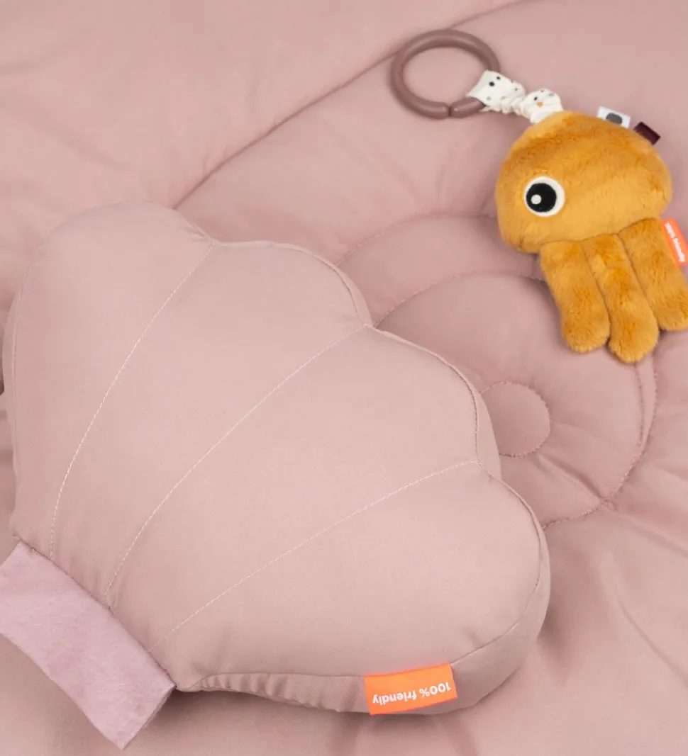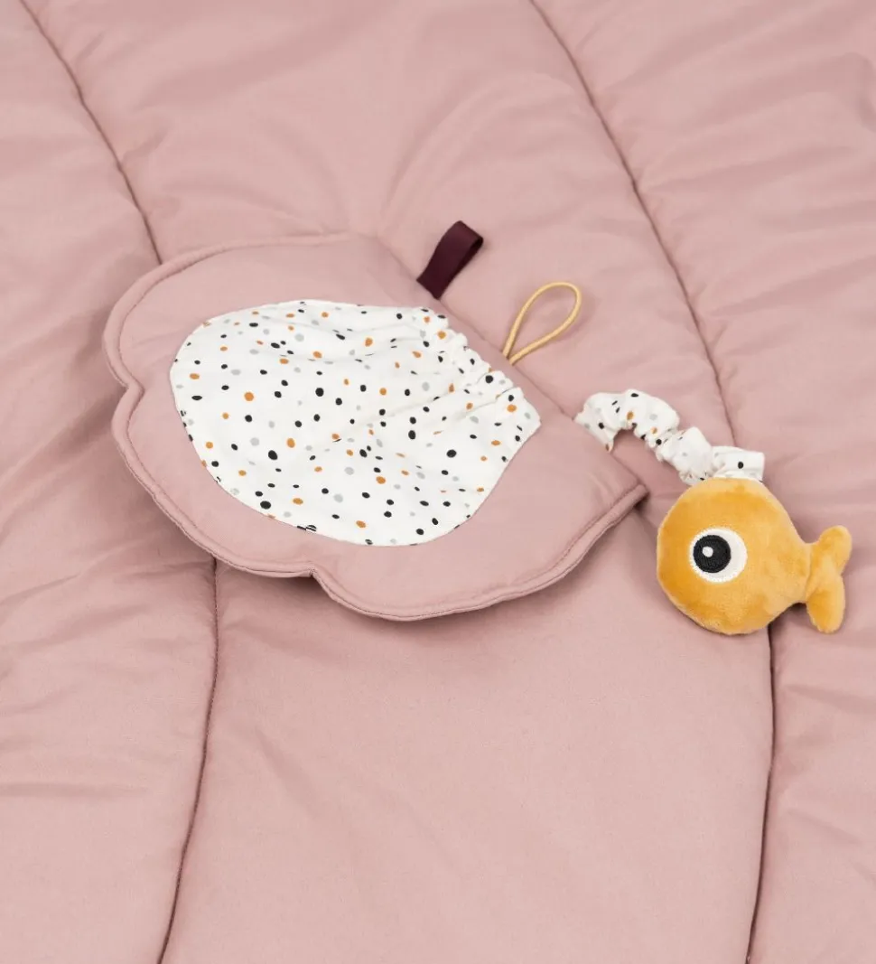 Tæppet er designet som en sød fisk med finner, der fungerer som nulreflapper og en enkelt som støttepude. Tæppet er utrolig blødt og tykt med et quiltet design, så barnet ligger behageligt. Til tæppet medfølger der 5 forskellige havdyr i form af aktivitetslegetøj, der stimulerer barnets sanser. Aktivitetslegetøjet hænges på stativet med de medfølgende C-ringe.