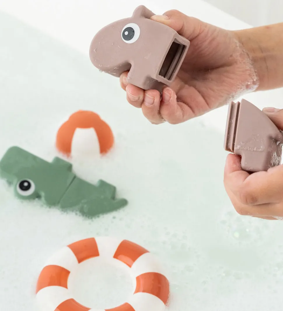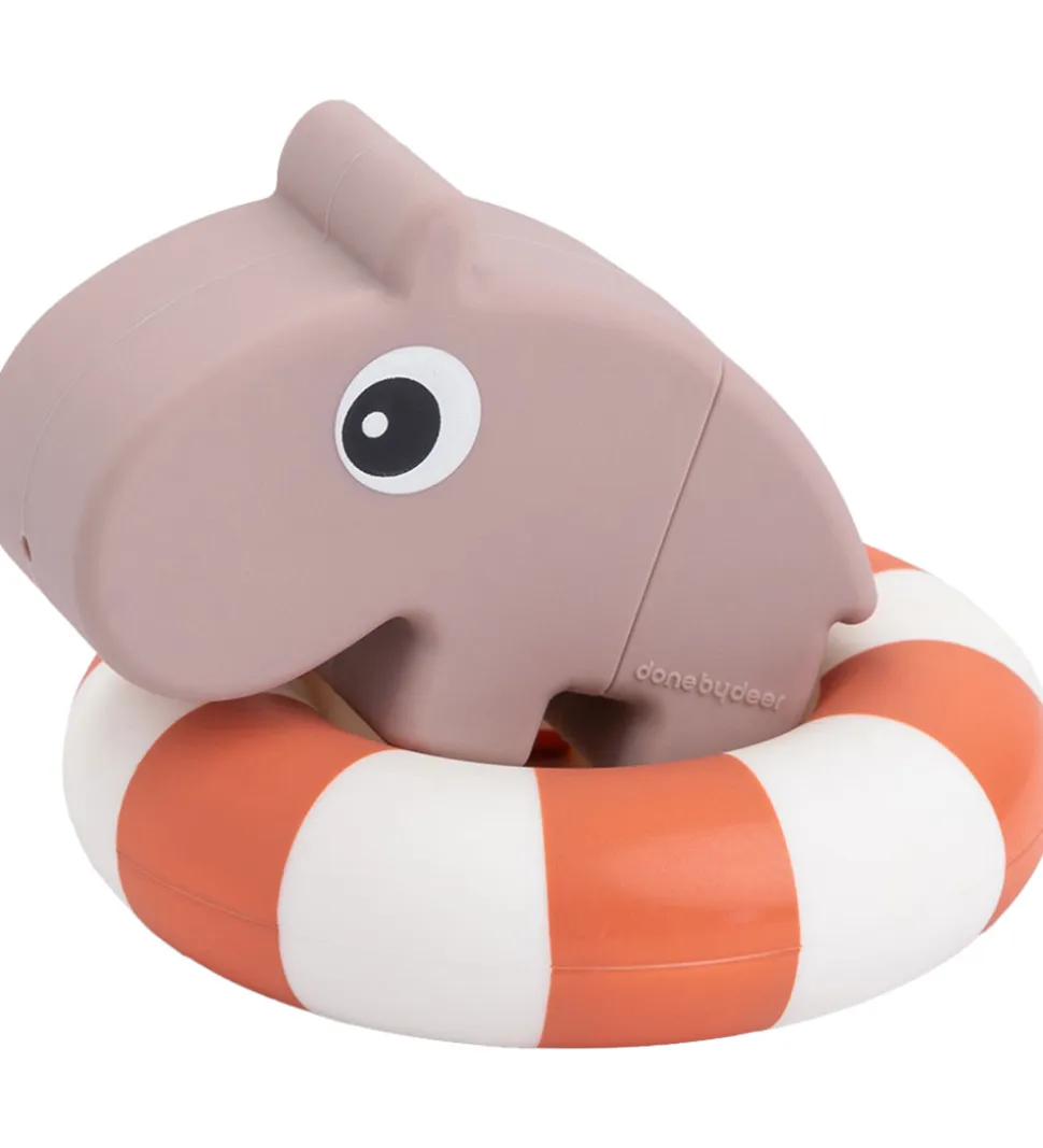 Done By Deer badelegetøjet vil underholde barnet når det er badetid. Flodhesten kan åbnes og blive fyldt op med vand, og sprøjter med vand hvis man giver den et klem. Badelegetøjet er med til at styrke barnets greb og finmotorik, samt giver den stribet badering visuel stimulering.