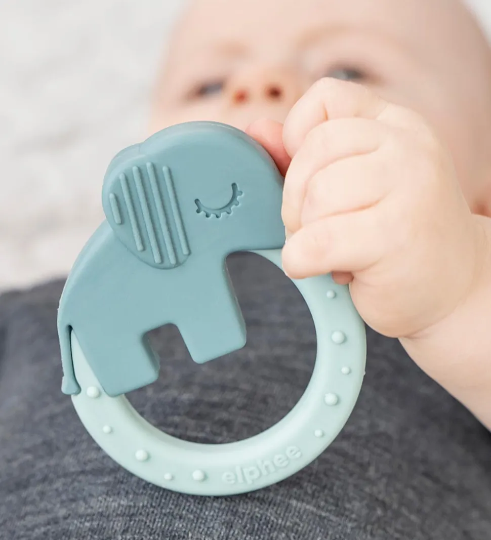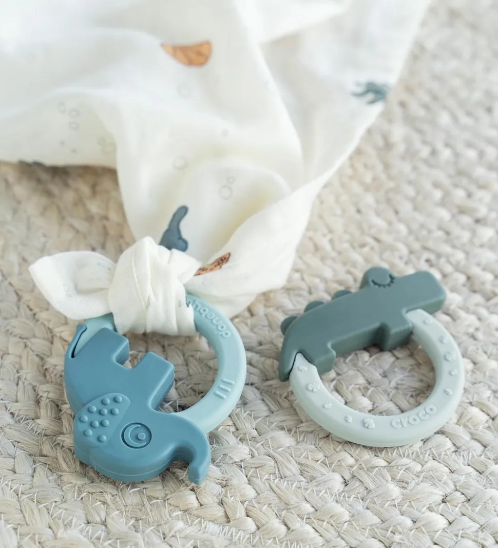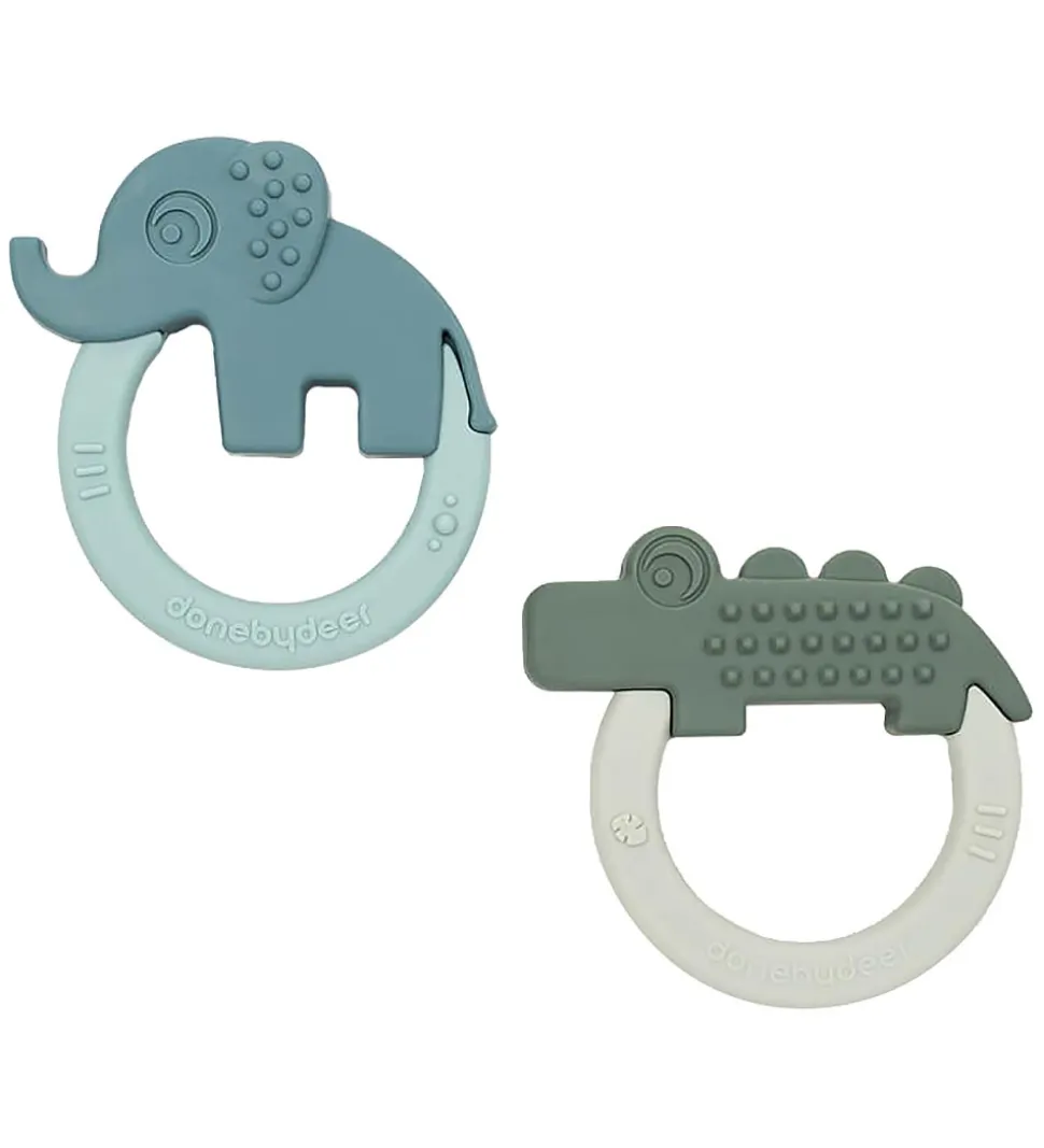 Skønne Done by Deer bideringe solgt i en 2-pak i grøn og blå, en med en elefant og en med en krokodille.