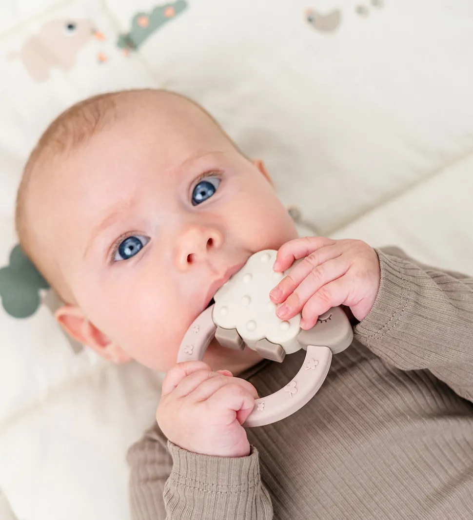 Done by Deer bideringen er lavet af silikone, hvor ringen er lavet af hård silikone mens fåret er lavet af blødt silikone. Bideringen har forskellige former og teksturer som er gode for gummer og tænder, mens ringen gør det nemt for barnet at holde fast i.