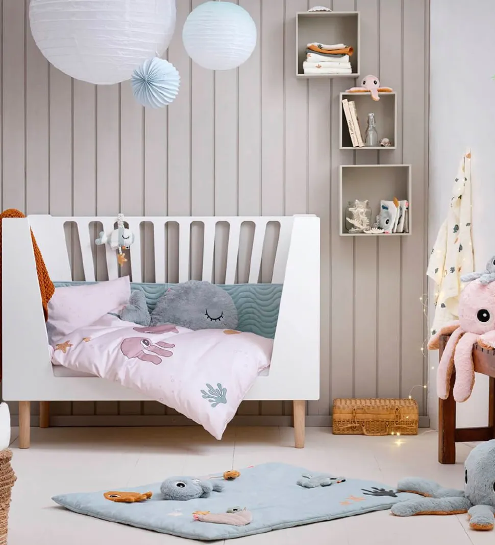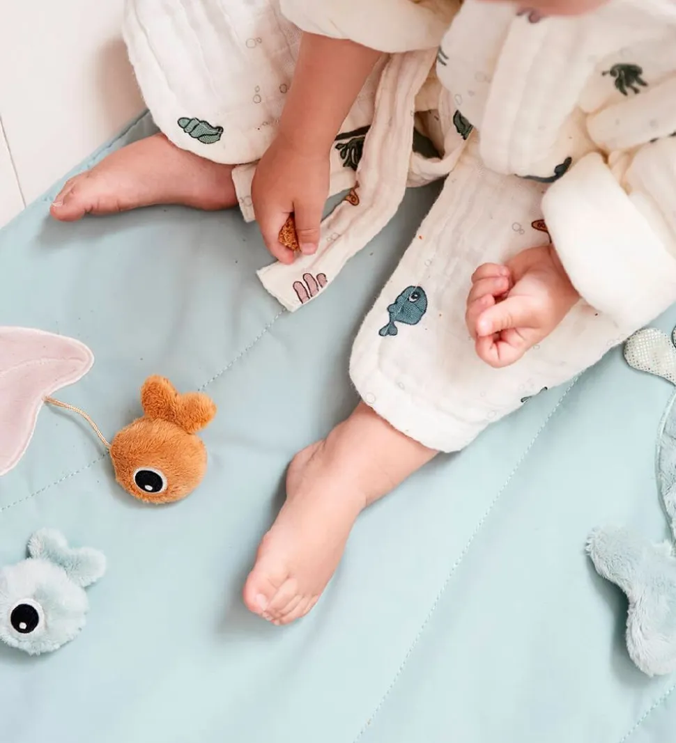 Skønt Done by Deer legetæppe støvet blå med skønne fisk, blæksprutter og planter i flotte farver. Tæppet har bølgede syninger.