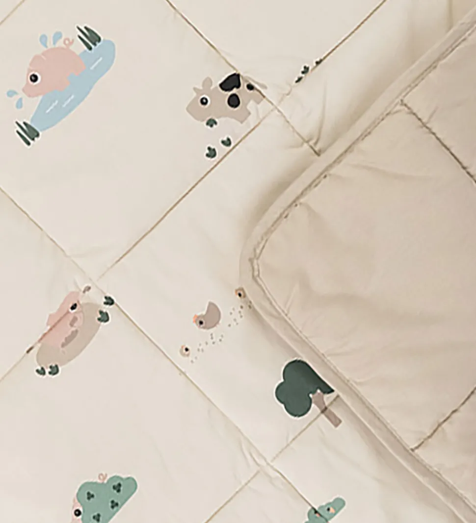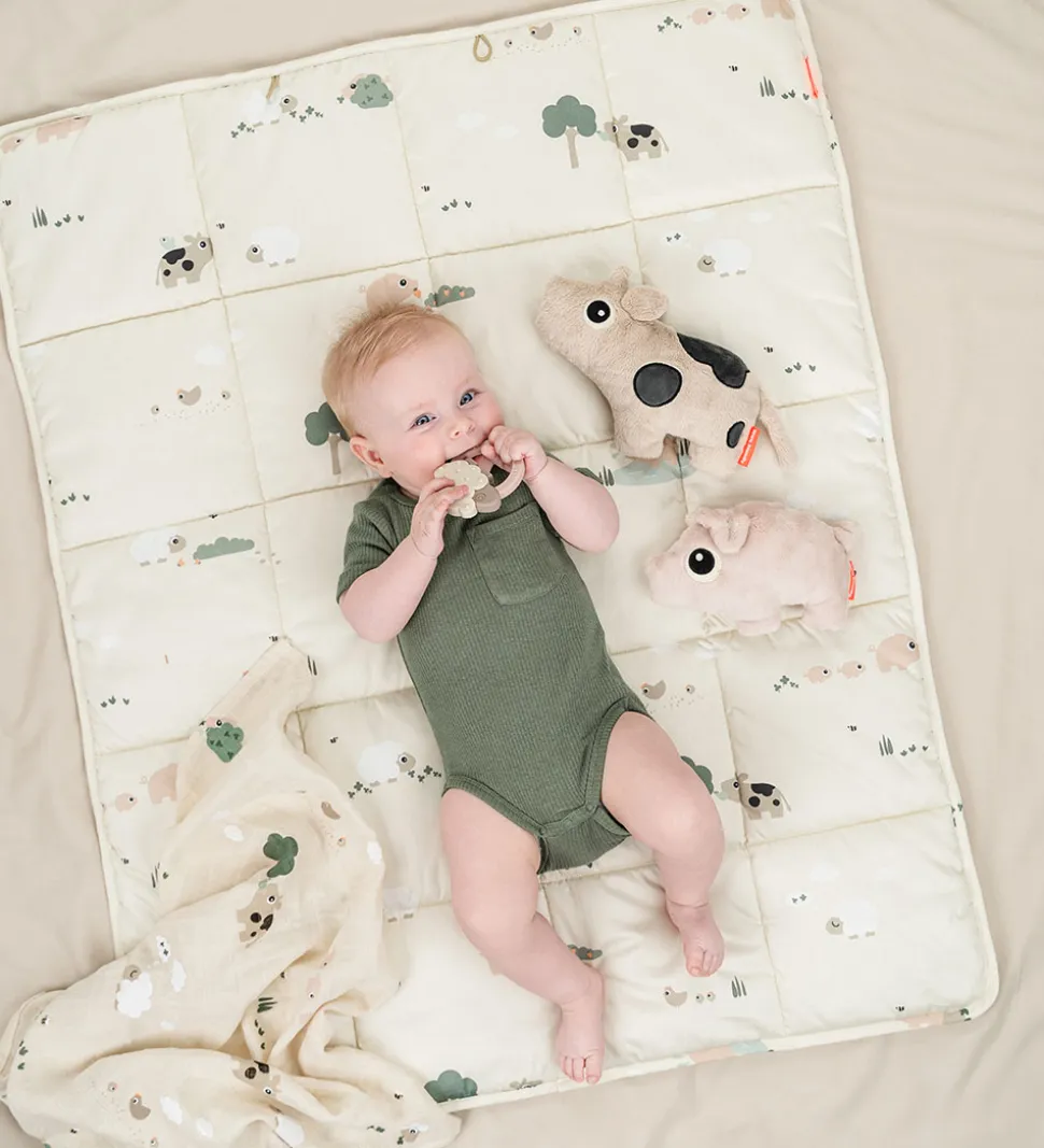 Skønt Done by Deer legetæppe i beige med print i et bondgårdstema og med en quiltet struktur.