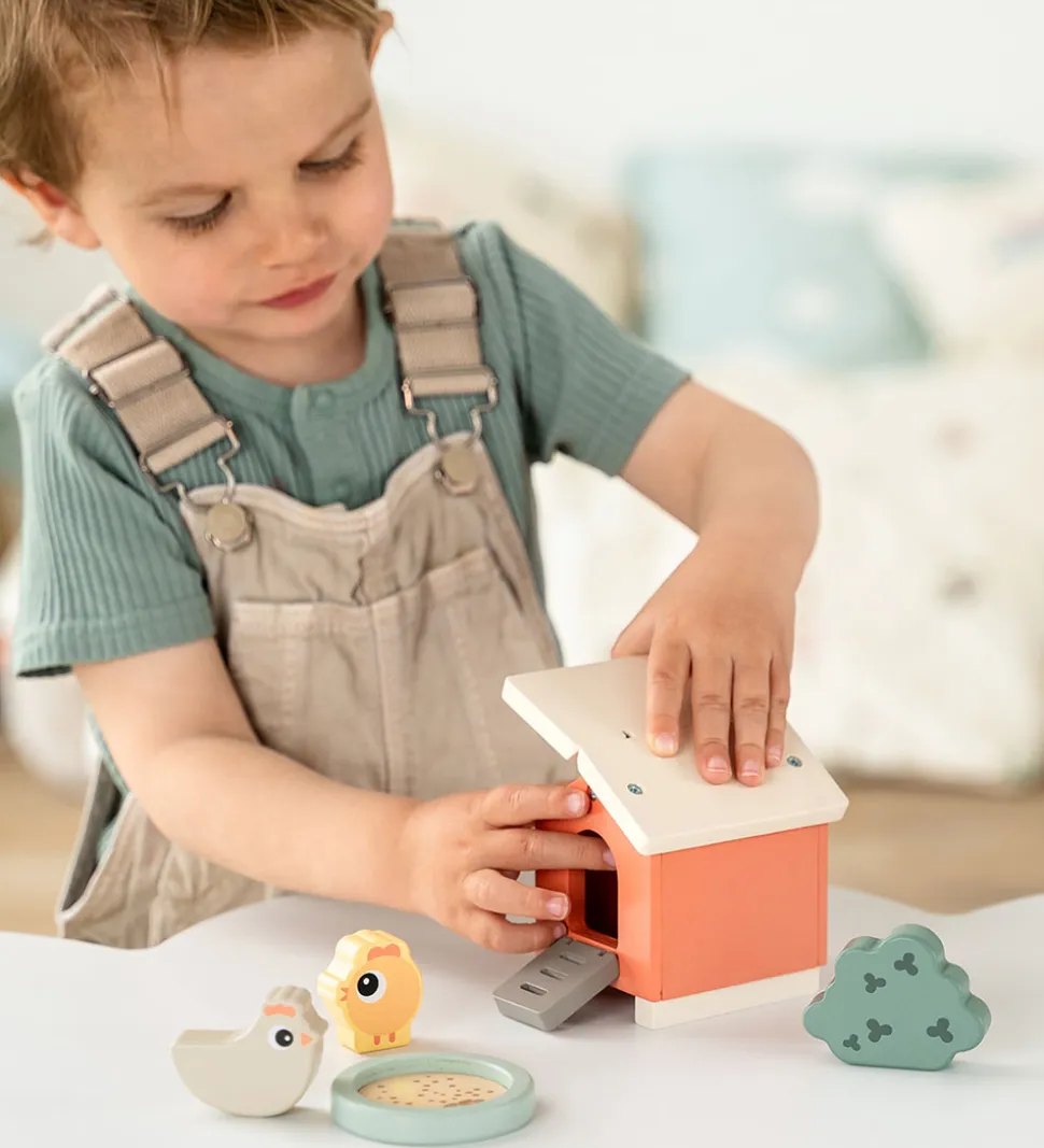 Hyggeligt Done by Deer legetøj bestående af et hønsehus med en høne, en kylling, et æg, mad og en busk. Hønsehuset har en smart trappe og et tag, som kan vippes op. Legetøjet er malet i fine farver og indbyder til kreative lege.