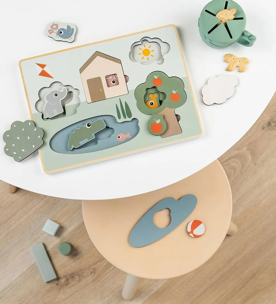Puslespillet træner finmotorik og pincetgreb samt udvikler barnet logisk tænkning og problemløsninger. Derudover er der sjove farver for visuel stimulering.