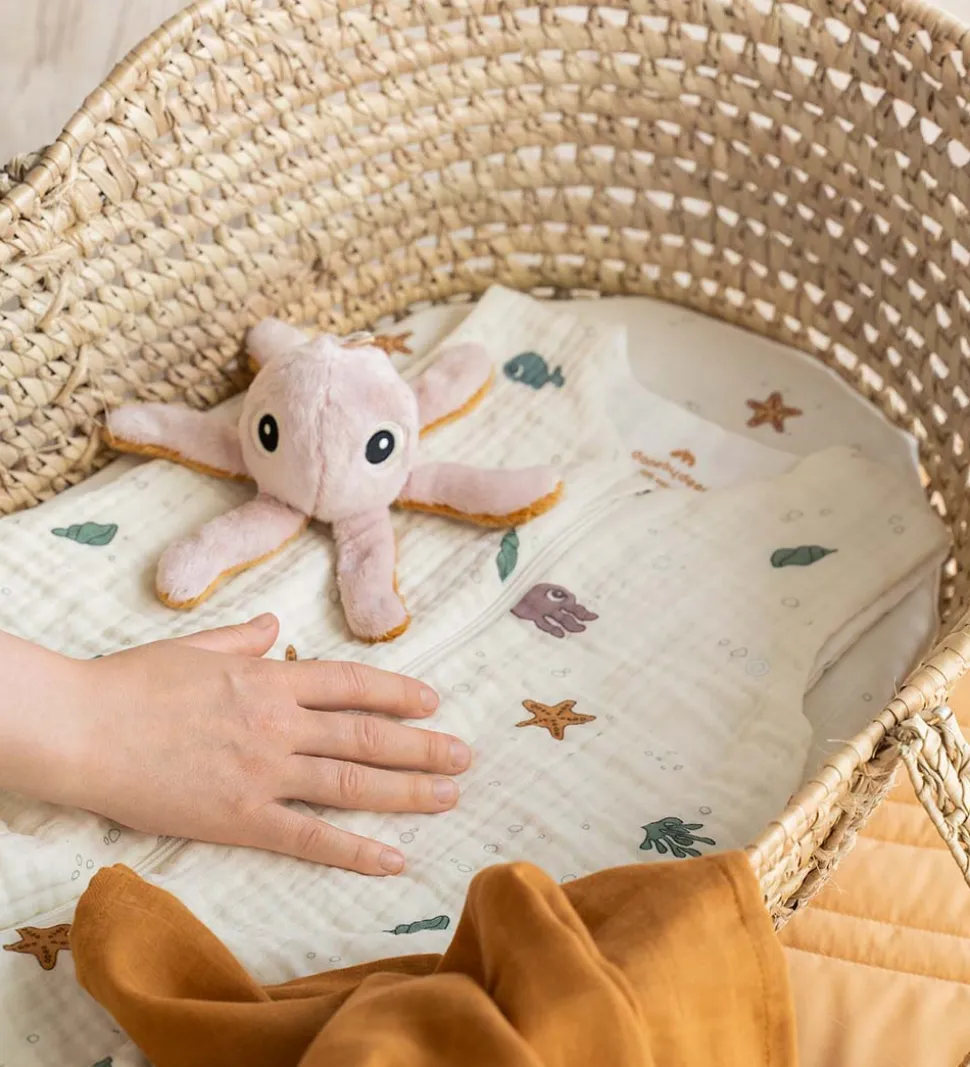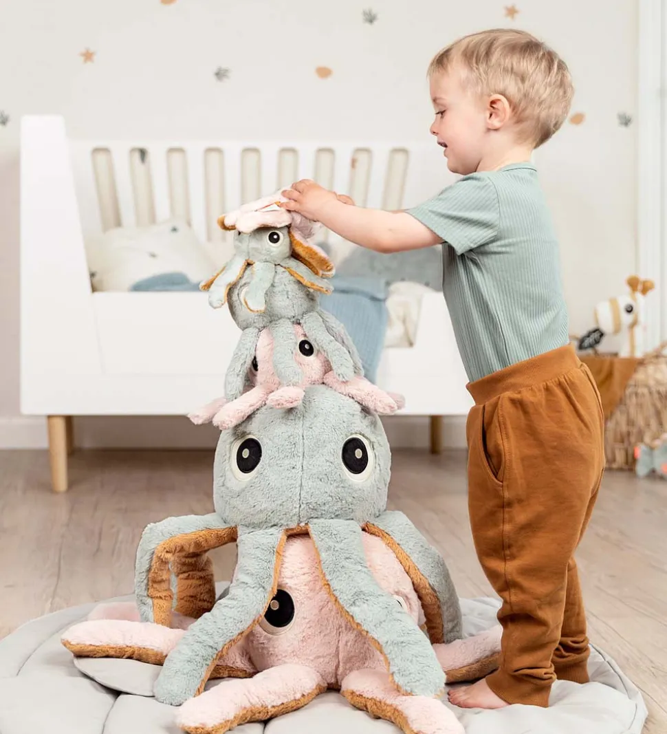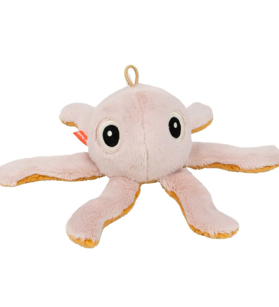 Done by Deer ranglen har en fin lille hank på hovedet, så den kan hænges op. Ranglen er lækker og blød at holde om, og når man ryster den, ringer klokken, som gemmer sig indvendigt. Blækspruttens arme siger også en spændende, knitrende lyd, når man tager fat om dem.