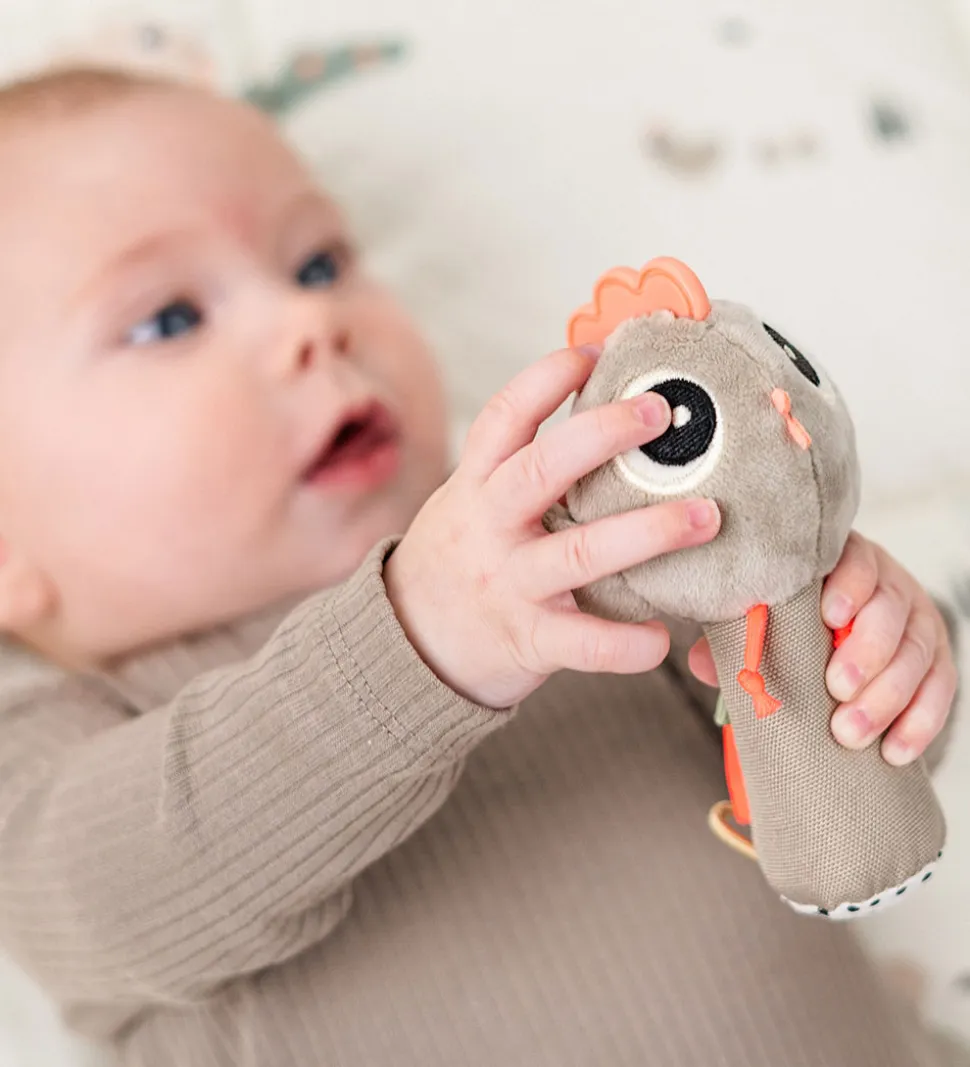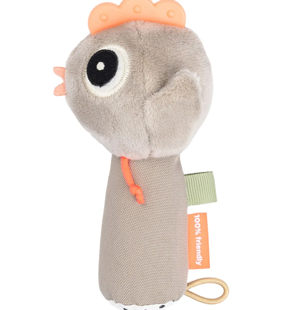 Done By Deer ranglen har en bjælde indeni, som klinger, når barnet leger med den. Ranglen har også knitrepapir og små plastikkugler indvendigt, som gør den sjov at undersøge. Hønens hanekam er lavet som et bidelegetøj til babyers ømme og kløende gummer. Ranglen har en hank på bagsiden samt en elastisk hank i bunden.