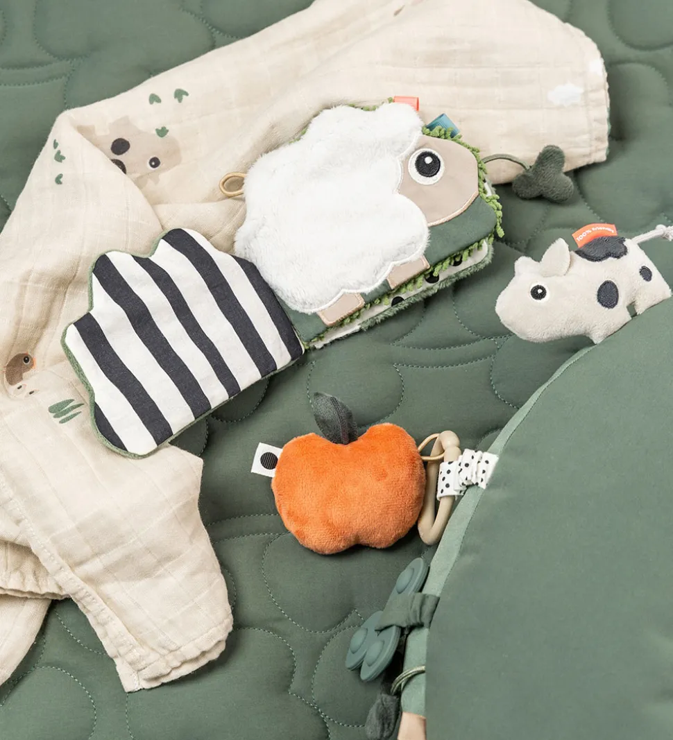 Done by Deer stofbogen har tre bløde sider med knitrepapir, forskellige teksturer af tekstil og nulreelementer, der alt sammen stimulerer barnets sanser.