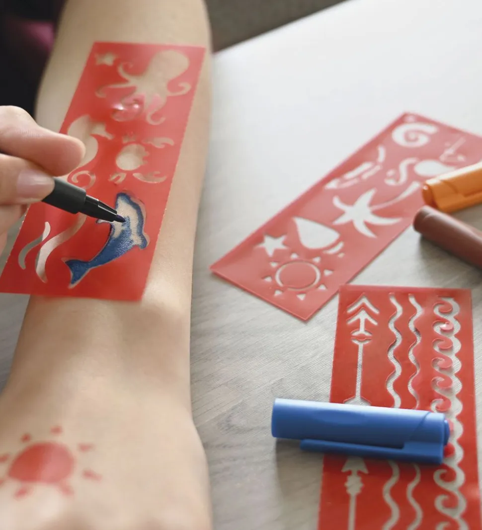Eberhard Faber tuscherne gør det muligt at tegne en masse seje tatoveringer. Disse tuscher har en ekstra fin tip på 0,5 mm, så man kan tegne fine detaljer. Der medfølger 4 skabeloner med over 20 motiver, så det er kun fantasien der sætter grænser.