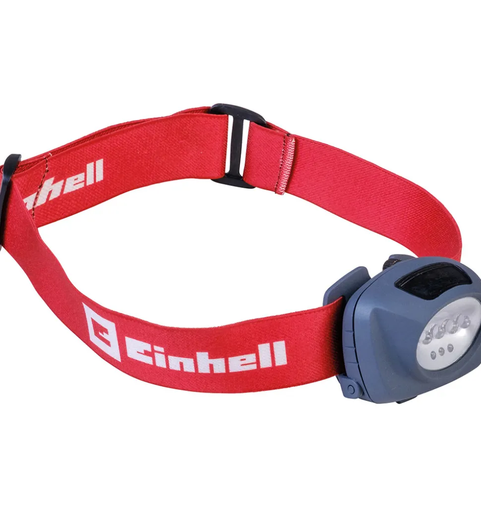 Praktisk Einhell pandelampe med justerbart hovedbånd i en klar rød farve. Designet inkluderer tre forskellige lysindstillinger og er perfekt til arbejde. Derudover kan lygten vippe 90 grader op og ned. Einhell lygten er ideel til både indendørs og udendørs brug.