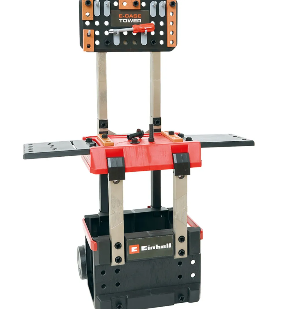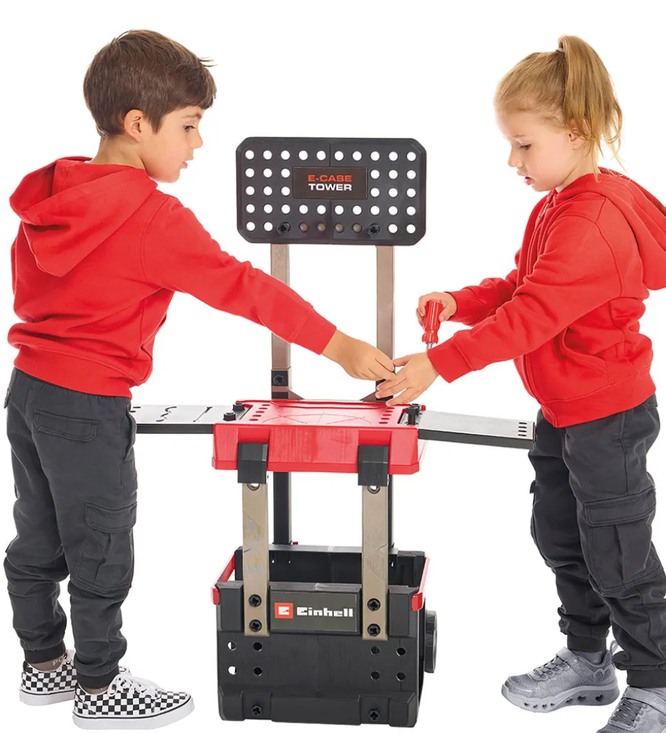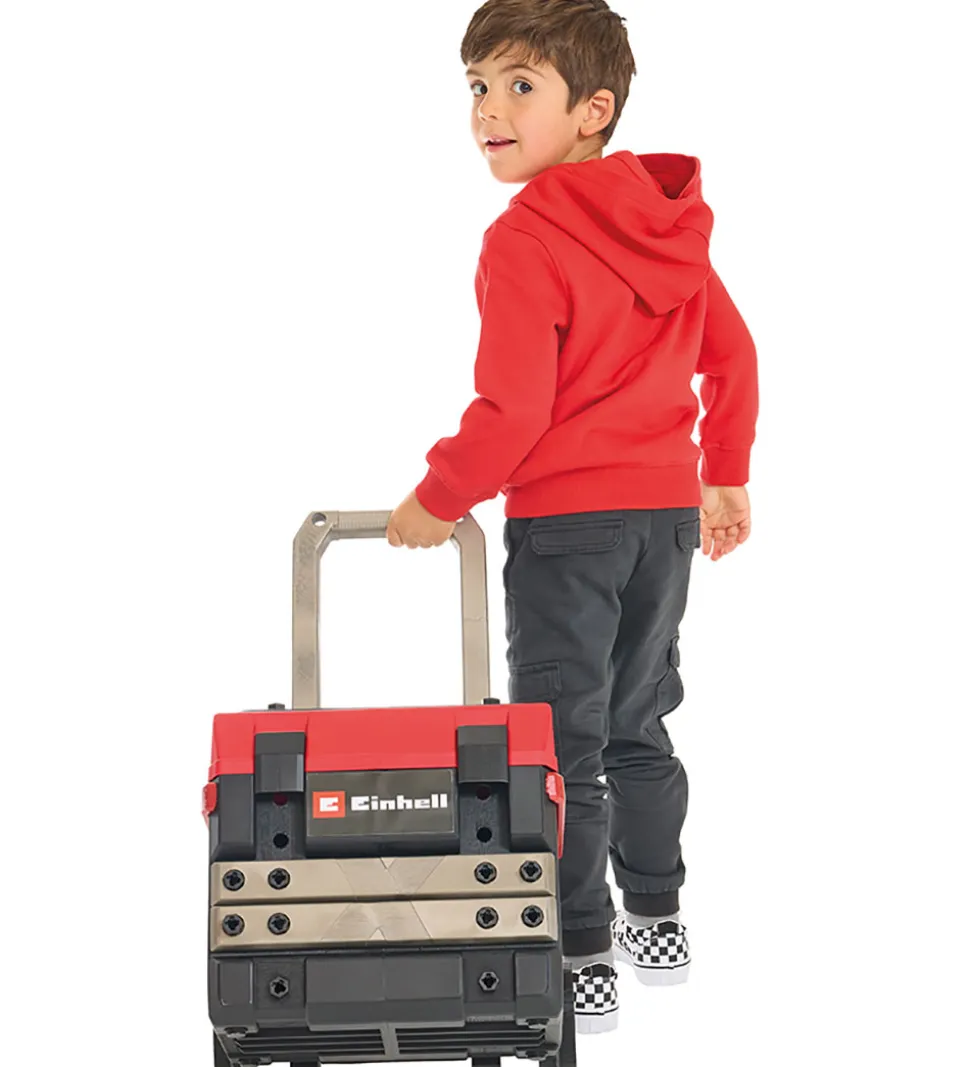 Praktisk Einhell værktøjsbænk i rød og sort med et smart design. Værktøjsbænken kan slåes sammen som en kuffert. Når den er slået ud, har barnet adgang til det medfølgende værktøj og tilbehør, som har sin egen plads.