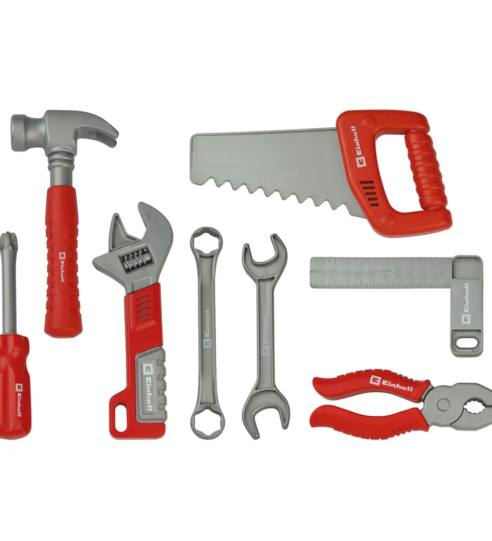 Smart Einhell værktøjskasse i grå med flotte røde detaljer. Sættet inkluderer forskellige værktøjer som: