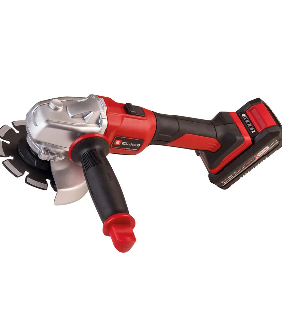 Smart Einhell vinkelsliber i rød med detaljer i grå og sort. Der medfølger tre forskellige slibeskiver og et udskifteligt batteri, som passer til alt Einhell værktøj.