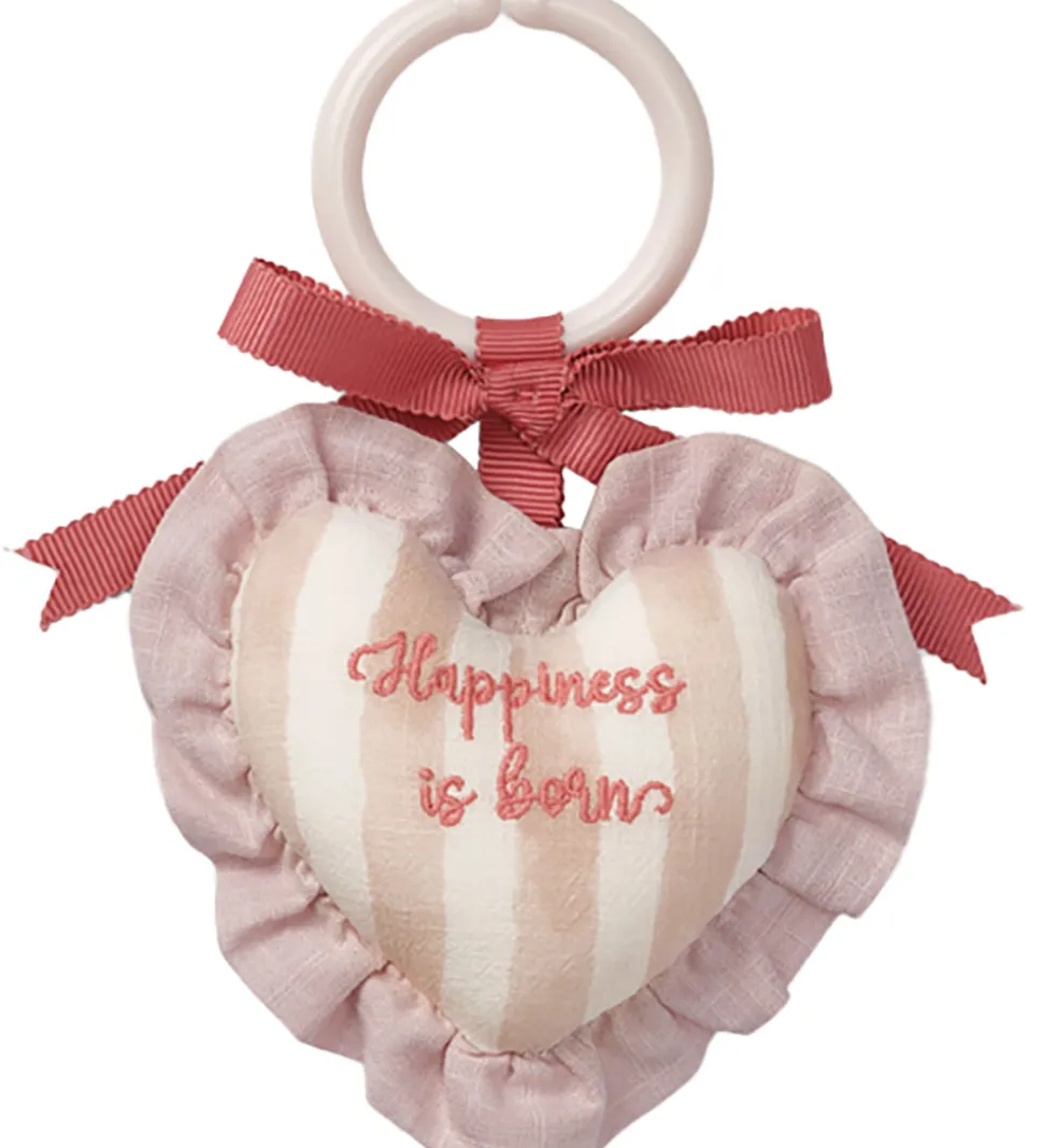 Skønt Elodie Details ophæng i en blød rosa nuance med striber og teksten “Happiness is born”. Det hjerteformede design er prydet med en fin flæsekant, der tilføjer en sød detalje.