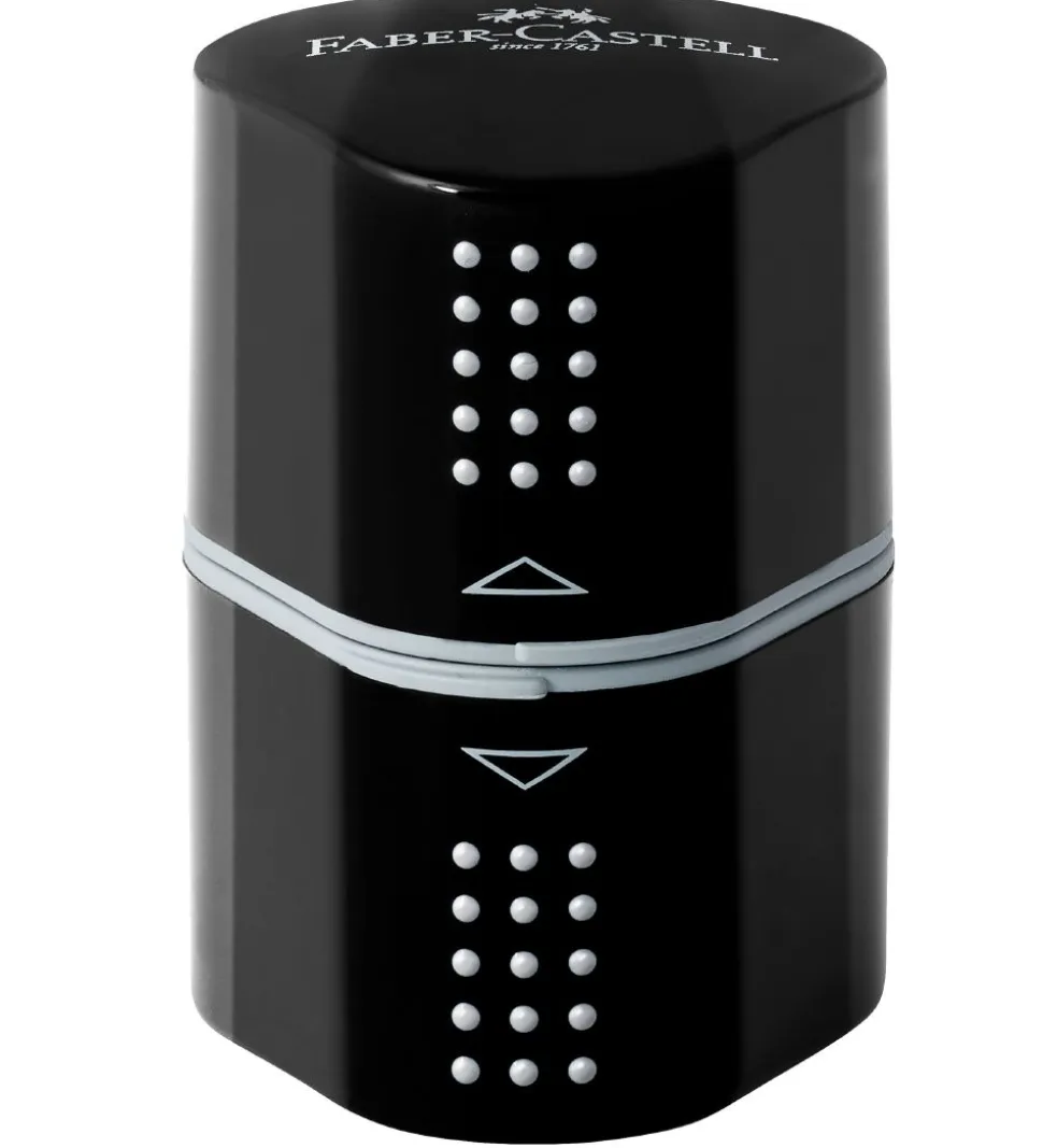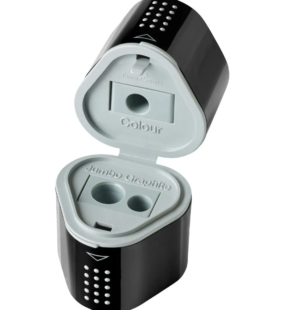 Faber-Castell blyantspidseren gør det nemt og praktisk at spidse blyanter, farveblyanter og jumbo blyanter. Blyantspidseren åbnes midt på, hvilket afslører tre huller i forskellige størrelser. Når blyantspidseren skal tømmes, tages de sølv dele af og tømmes let.