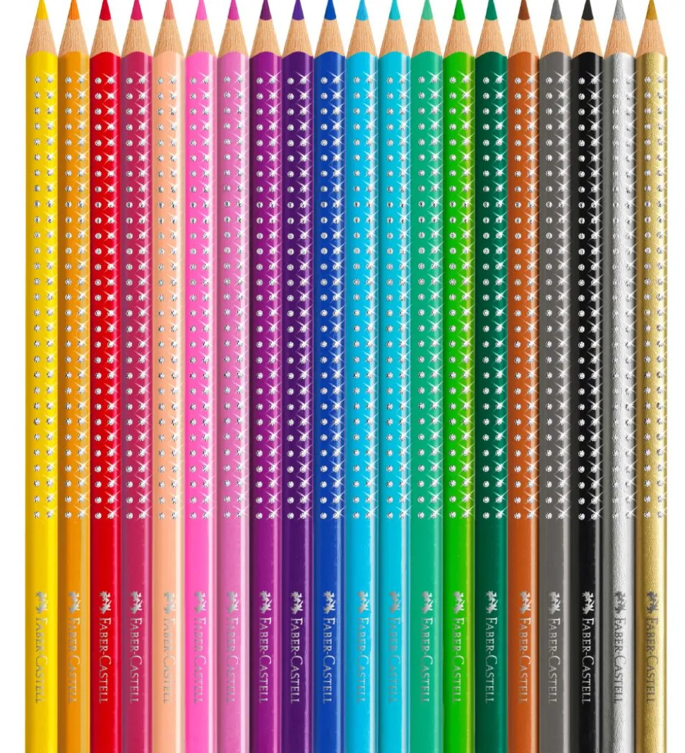 Faber-Castell farveblyanterne har en ergonomisk trekantet form, med de klassiske knopper på ydersiden med en flot glimmereffekt, som giver et godt greb. Farveblyanterne kan bruges af både højre- og venstrehåndet. Blyantspidseren gør det nemt og praktisk at spidse blyanter og farveblyanter.