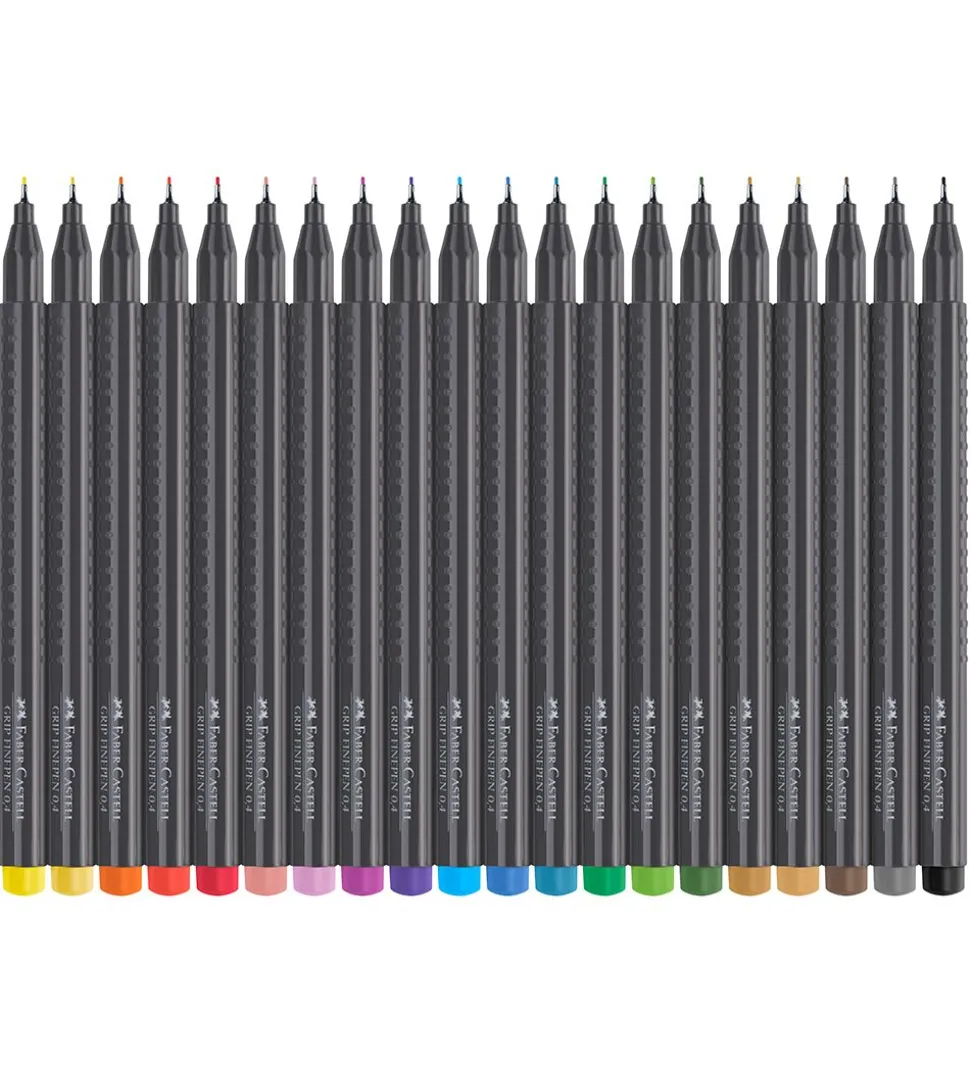 Faber-Castell finelinerene har en ergonomisk, trekantet form med praktiske knopper på stiftet som giver et godt greb. Lågene er ventilerende, så farverne ikke tørrer ud og de har en ekstra smal spids, så man kan få de helt små detaljer med. Farverne er baseret på madfarve.