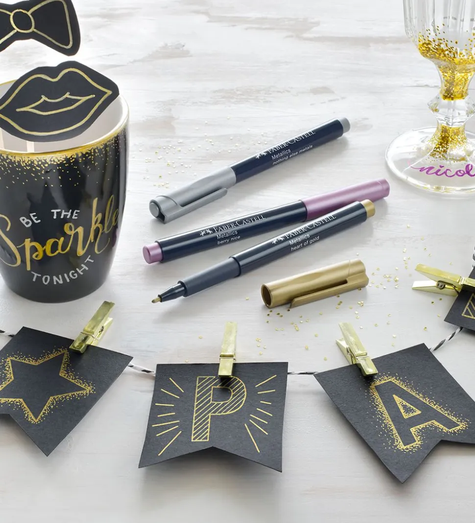 Flotte Faber-Castell tuscher i seks metalliske farver, sølv, guld, bronze, lilla, turkis og grøn.