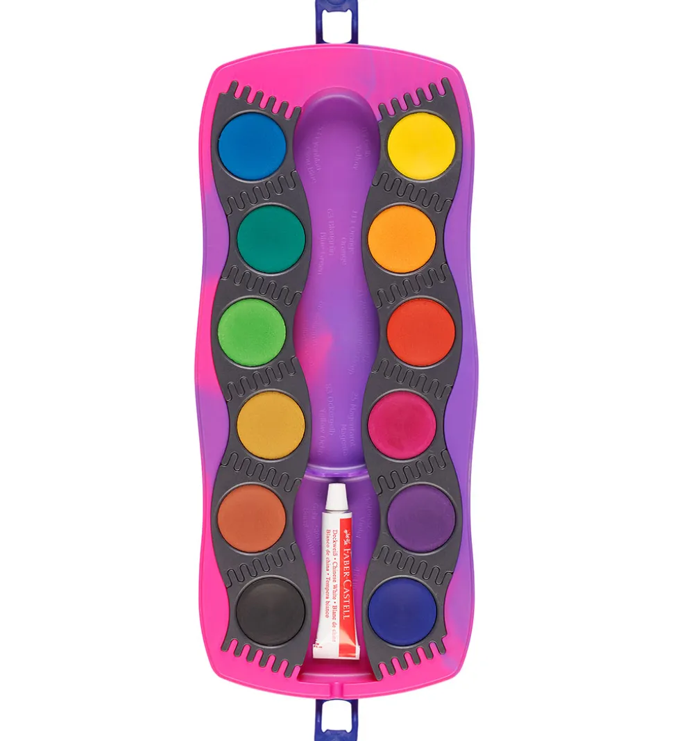 Faber-Castell vandfarven kommer i en stor æske og de individuelle farver er i en lille plastikform, som kan sættes sammen, som gør det let at have styr på de mange flotte farver. I låget er der runde udformninger, som kan bruges til at blande farverne sammen.