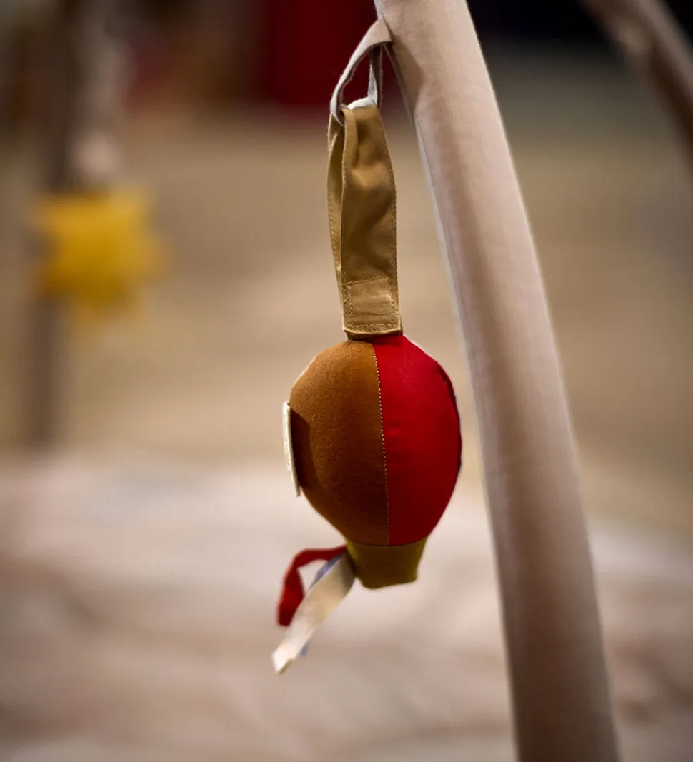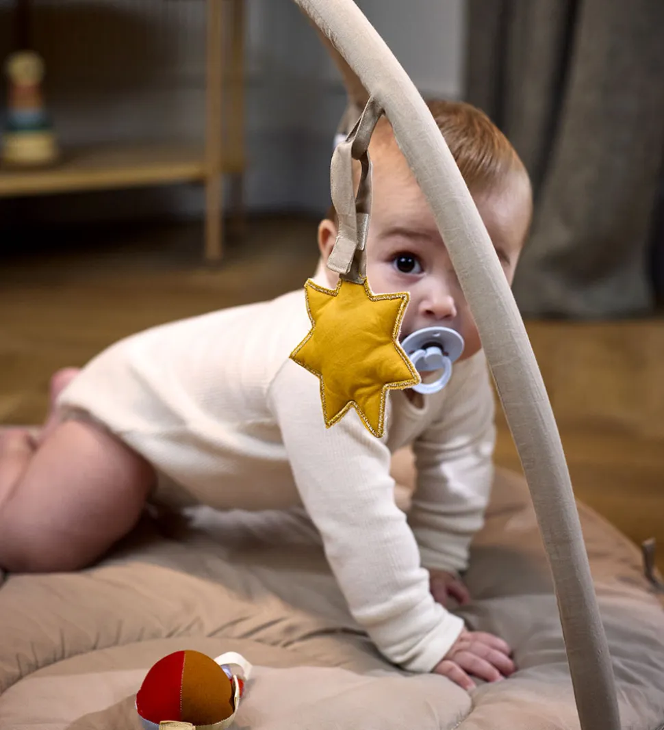 Charmerende Filibabba aktivitetslegetøj bestående af en luftballon med raslelyd, en sol med spejl og en hval med raslelyd og knitrepapir, hver med en praktisk velcrostrop til ophængning.