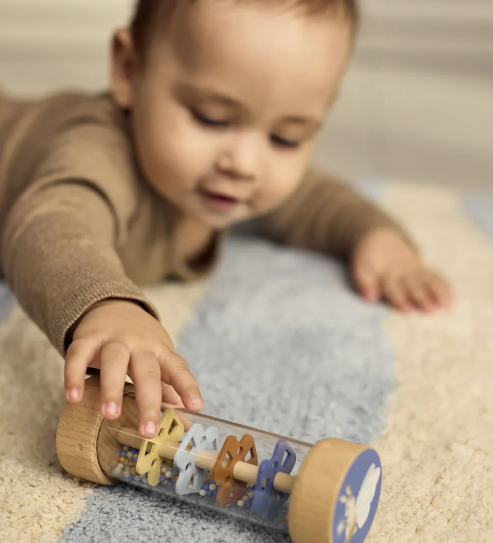 Fin legekuffert i lyseblå med fantasifuldt dyreprint i brun. Kufferten indeholder tre rangler i træ med fine farver.