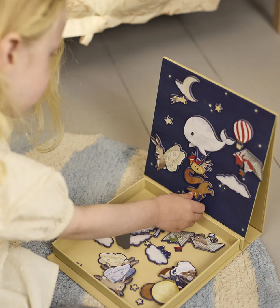 Hyggeligt Filibabba magnetlegetøj bestående af en gul æske med eventyrligt tema. Æsken indeholder 30 små magneter med motiver af bl.a. dyr, stjerner og luftballoner, som kan sættes på indersiden af æsken, og lave hyggelige billeder. Perfekt til fantasifuld leg og kreativ udfoldelse.