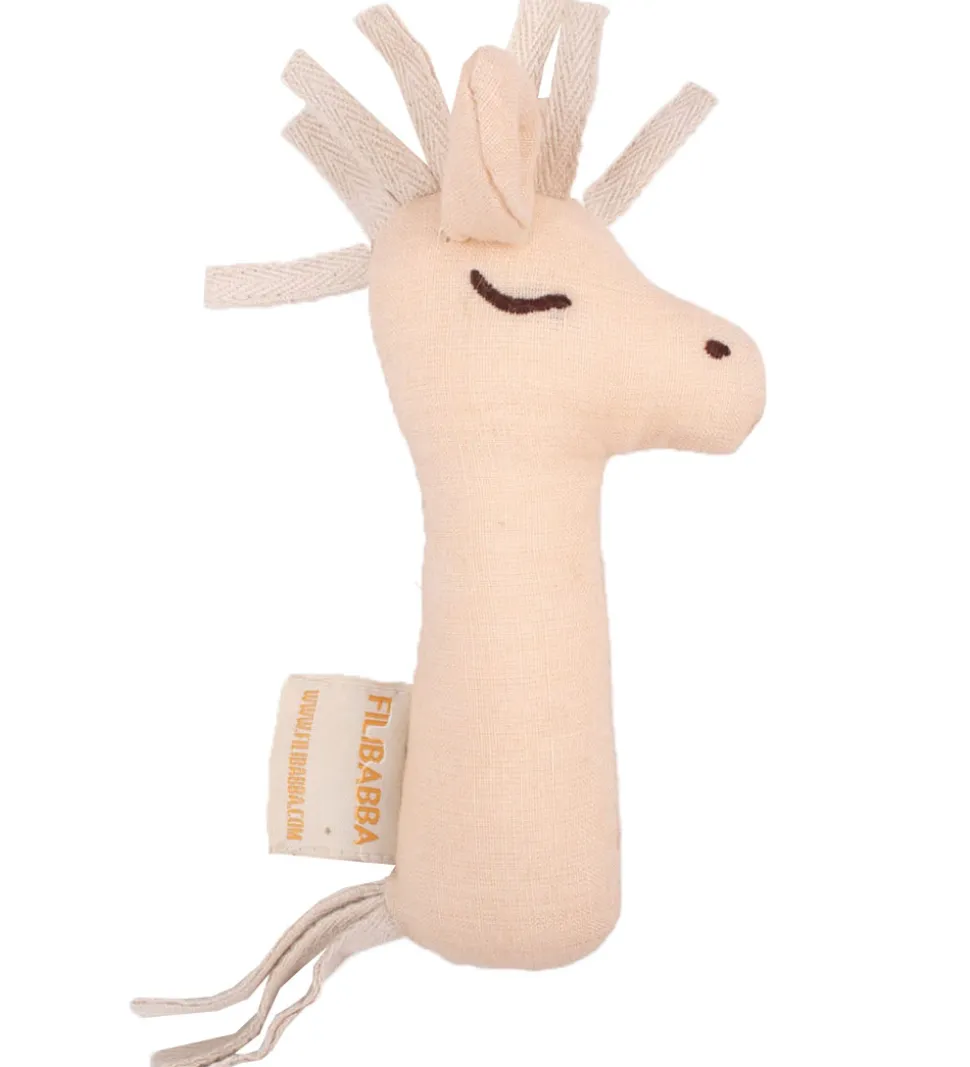 Sød Fillibabba rangle med form som en beige hest med håndtag i hør med broderede detaljer.