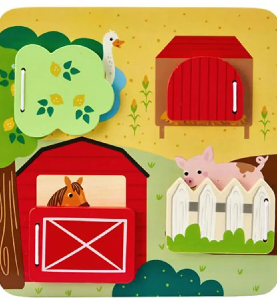 Fisher Price aktivitetspladen har fire flapper i i træ, som flappes op for at se hvilke dyr, der gemmer sig på bondegården.