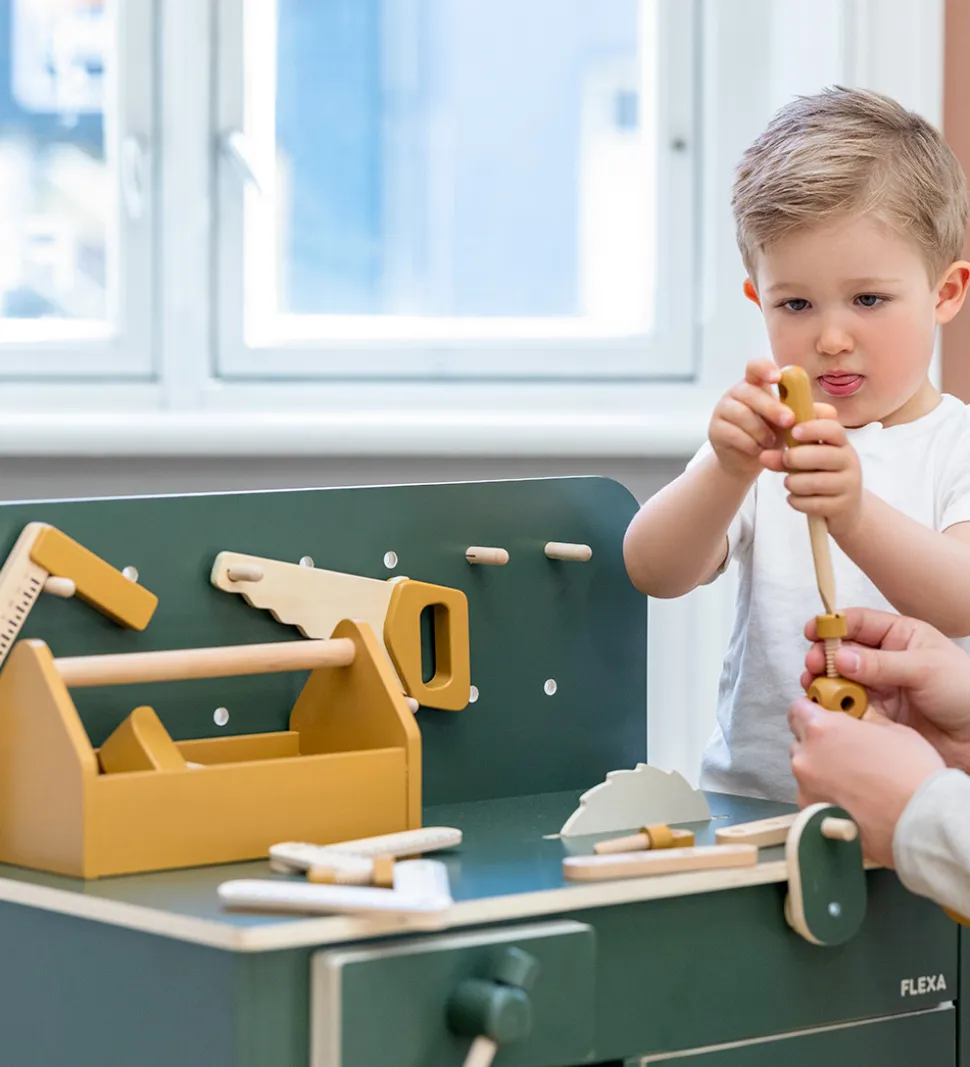 Flexa trælegetøjssættet er perfekt til den lille håndværker og indeholder 4 dele i form af:
