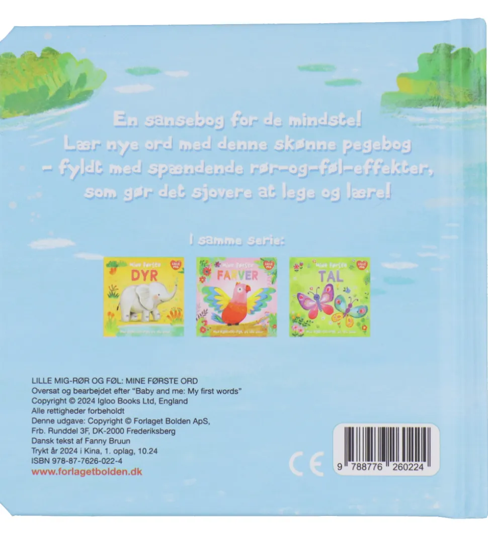 Bolden bogen indeholder farverige illustrationer med spændende detaljer og strukturer, som er sjove at røre ved. Bogen hjælper med at lære barnet sine første ord. Bogen har kraftige sider, så den ikke så let går i stykker.